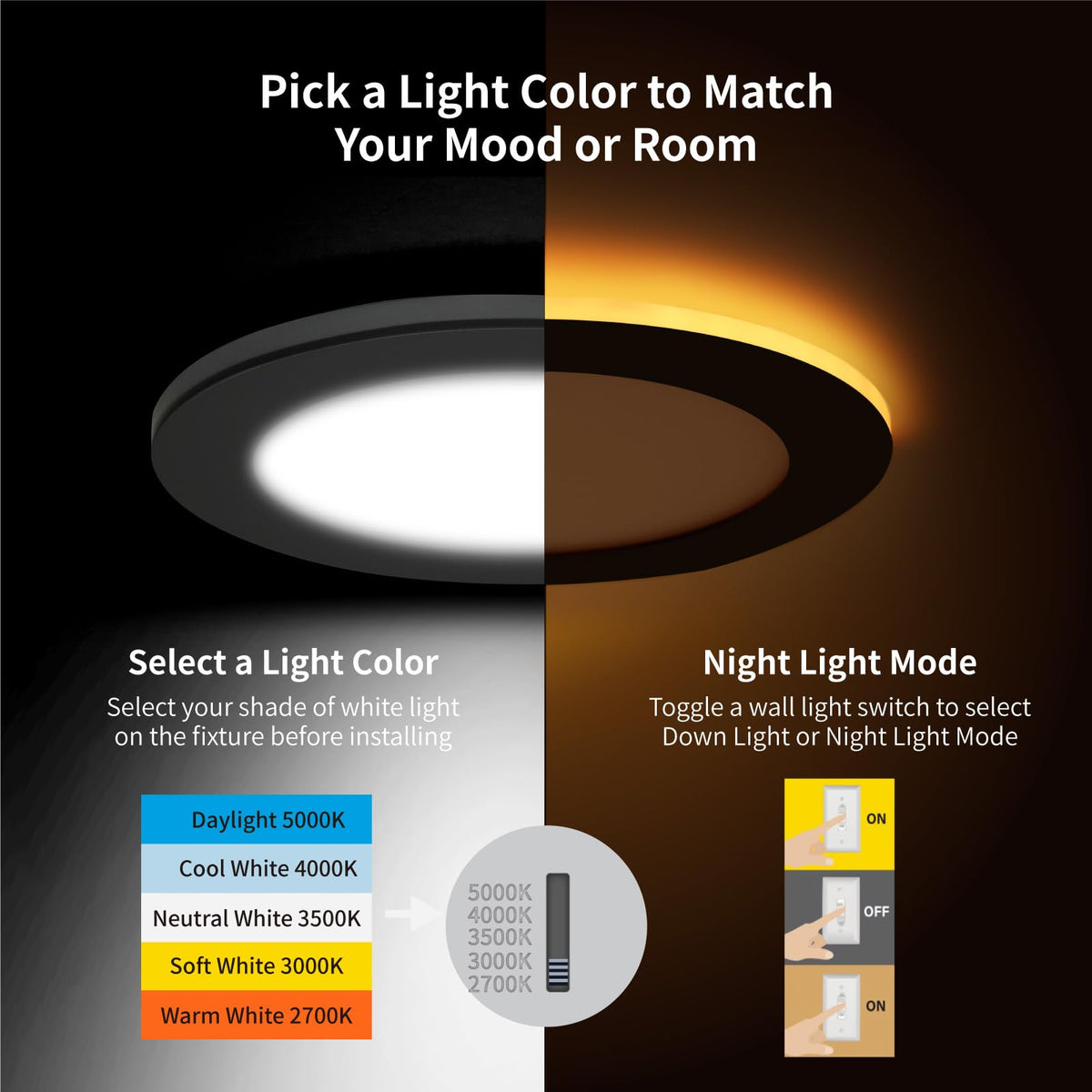 Q: What is the color temperature range of the Meconard 6 Pack LED Recessed Ceiling Light?A: The Meconard LED Recessed Ceiling Light features a 5CCT selectable color temperature range of 2700K, 3000K, 3500K, 4000K, and 5000K, allowing you to choose the perfect ambiance for any room.