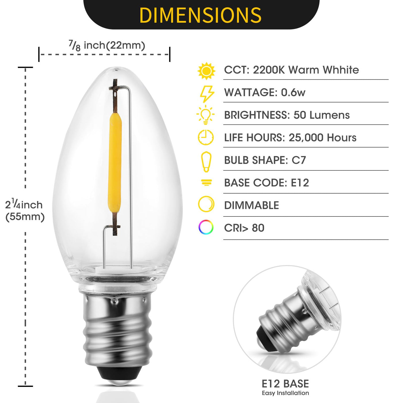 Q: What color light do the LED bulbs emit?A: The C7 LED bulbs emit a warm white light, creating a cozy and inviting atmosphere for your holiday decorations and displays.
