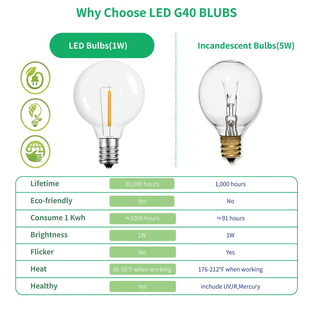 Q: What are the key benefits of using Meconard G40 LED replacement light bulbs?A: Meconard G40 LED replacement light bulbs offer several benefits, including energy efficiency, as they use only 1 watt of power while providing the same light output as a 5-watt incandescent bulb. They are shatterproof, making them safer for both indoor and outdoor use. Additionally, these bulbs provide a warm white glow, creating a cozy ambiance.