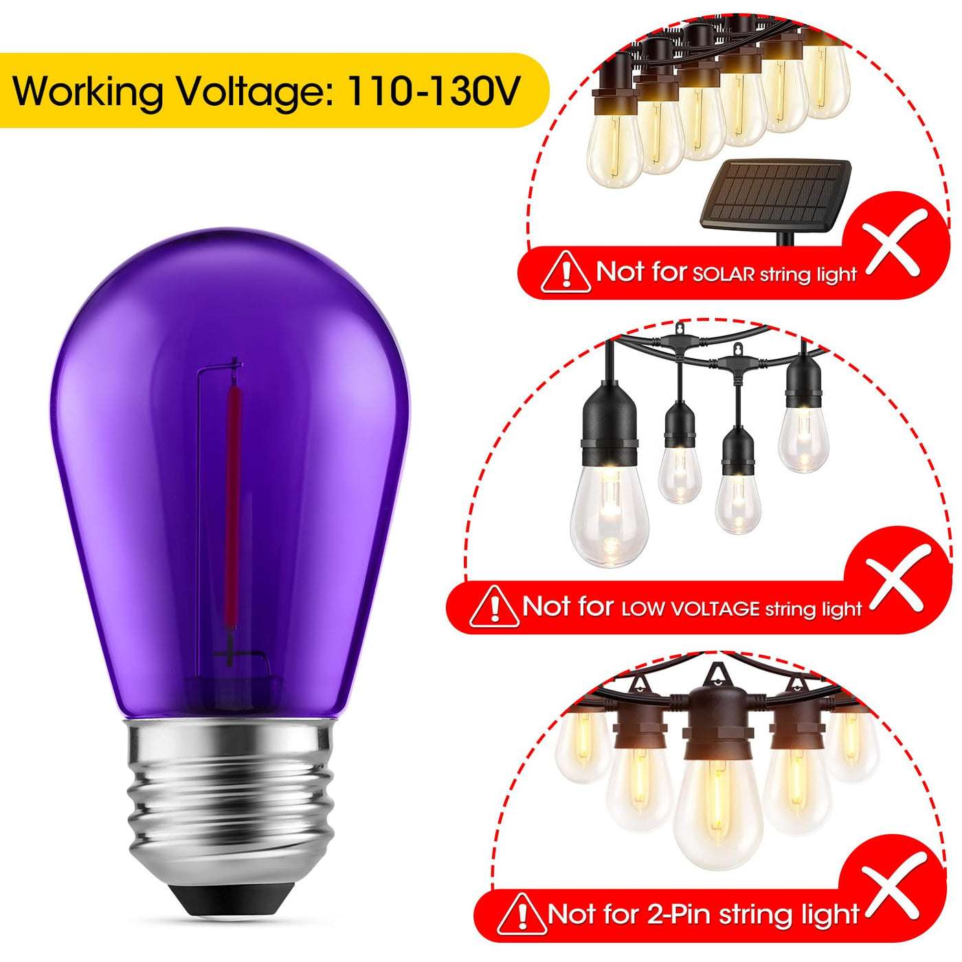 Q: Are the Meconard S14 Purple and Orange LED Light Bulbs suitable for outdoor use?A: Yes, the Meconard S14 Purple and Orange LED Light Bulbs are waterproof and designed for both indoor and outdoor use, making them perfect for your Halloween decorations or any outdoor string light setups.