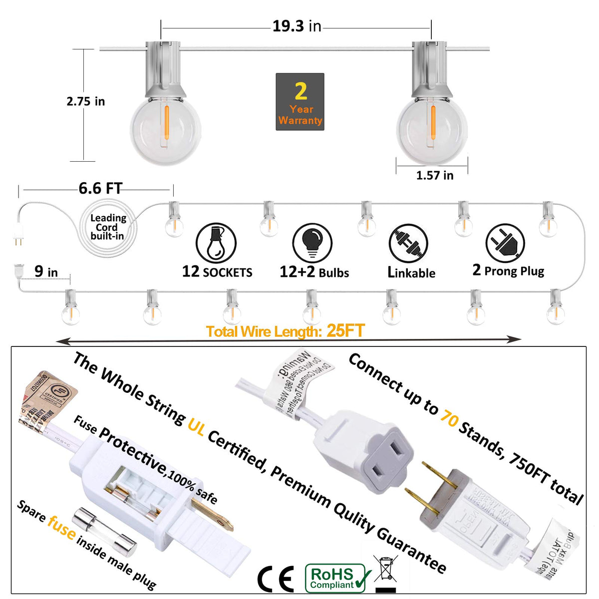 25Feet Outdoor Globe String Lights come with Commercial Grade Heavy-Duty cord with 12 E12 suspension Sockets 14(2 extra) Shatterproof Plastic LED Bulbs can create warm ambience and relaxing atmosphere for outdoor romantic Wedding,parties,festival celebrations and home decor.Suitable for indoor occassions as well, like room,Balcony,Restaurant or tent decor to have exotic ambience ?Important Features ? G40 globe Led String Lights can be connected up to 50 Strands to make your outdoor and indoor events unforgettable ?Upgraded IP45 waterproof outdoor LED string lights can be used all year round,in windy,rainy,snowy and icy days ?ETL listed strand,Born for outdoor and indoor use,Cafe string lights is light weight and potable, you can straight them or wrap them in trees or tent