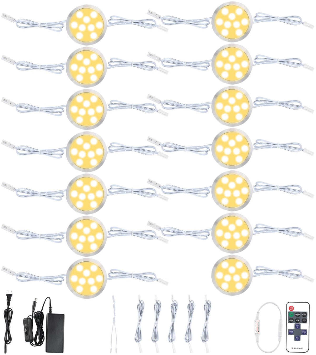 Meigour Hardwired Under Counter Puck Light, Linkable and Wireless Remote Control Dimmable LED Closet Lights Kit, 110V Direct Wired Plug In Kitchen Above Cabinet Lighting, 14 Lights, Warm White