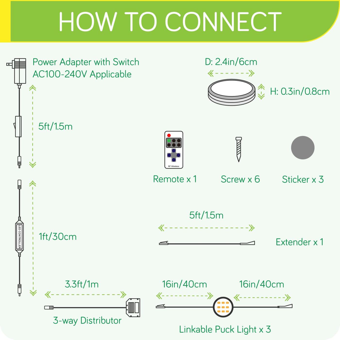 Meigour Under Cabinet LED Puck Lighting Kit, Linkable Wiring Connection, Dimmable RF Wireless Remote Control, 120V Wall Plug, 3 Lights, Warm White
