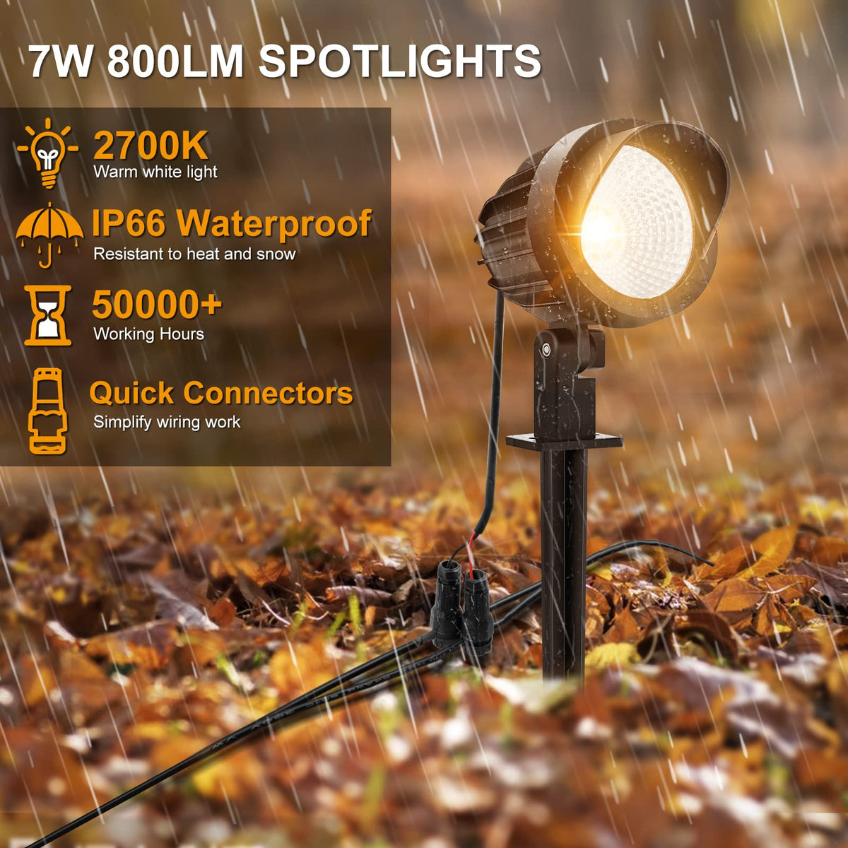 Q: How weatherproof are these landscape lights?A: The MEIKEE landscape lights have an IP66 waterproof rating, ensuring they are built to withstand rain, snow, and extreme weather conditions, making them durable for long-term outdoor use.