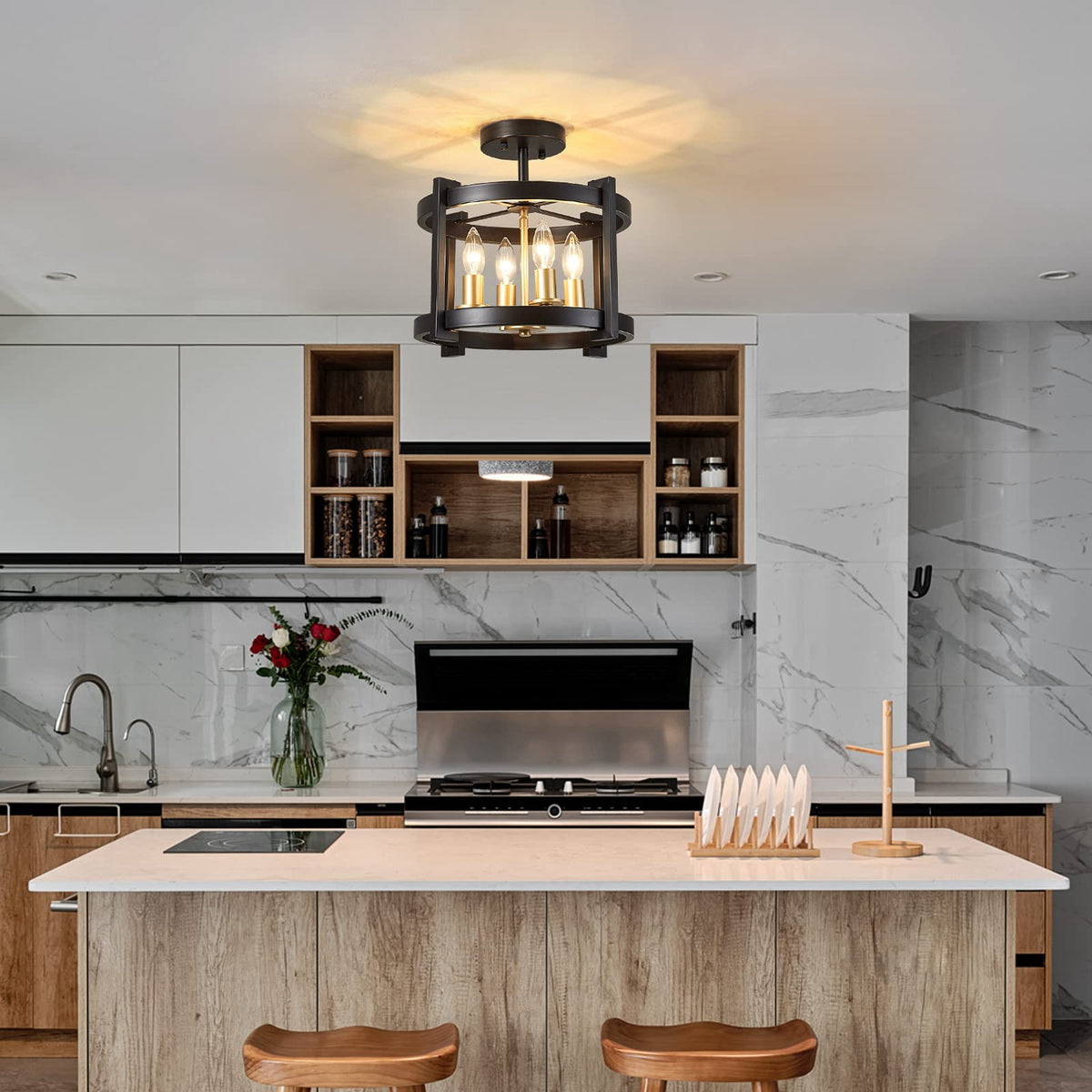 Q: What type of bulbs can be used with the MEIXISUE 4-Light Semi Ceiling Light?A: The MEIXISUE 4-Light Semi Ceiling Light is compatible with E12 light bulbs, including LED, energy-saving, and halogen bulbs, allowing you to choose the best lighting option for your space.