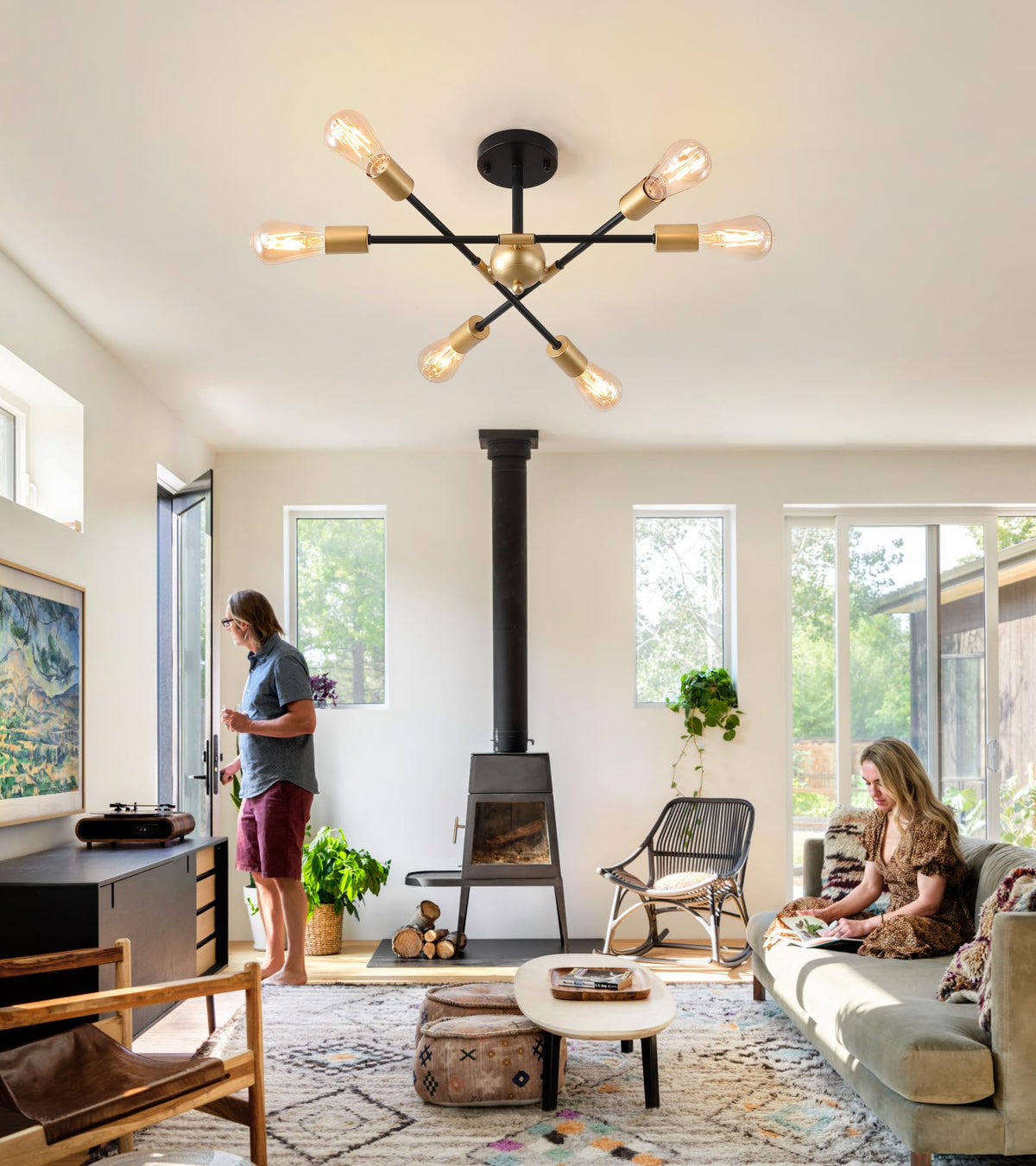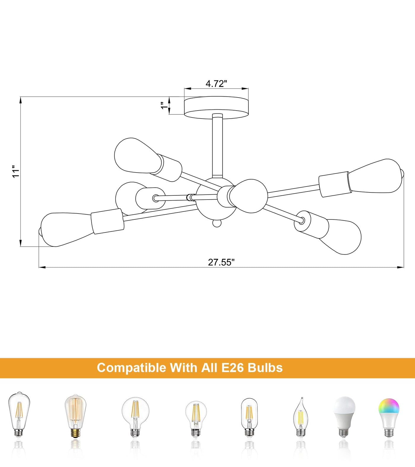 Meixisue Modern Semi Flush Mount Ceiling Light Fixture Black And Gold Close To Ceiling Light 6-Light Sputnik Chandelier Light Fi