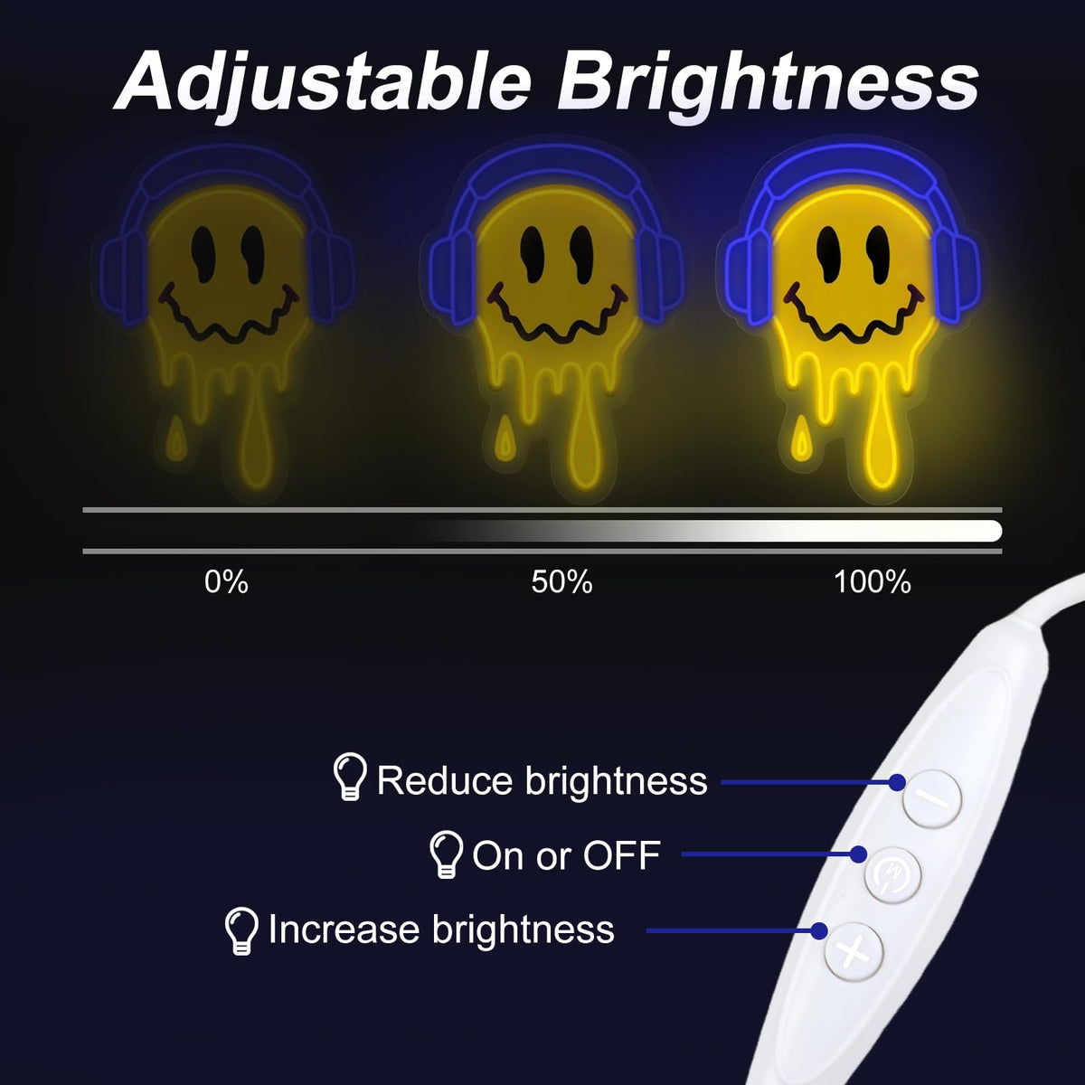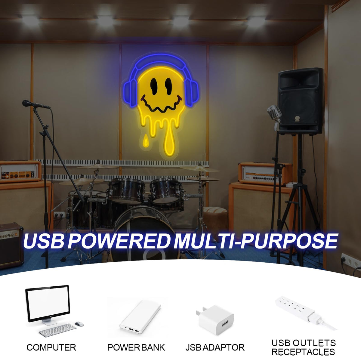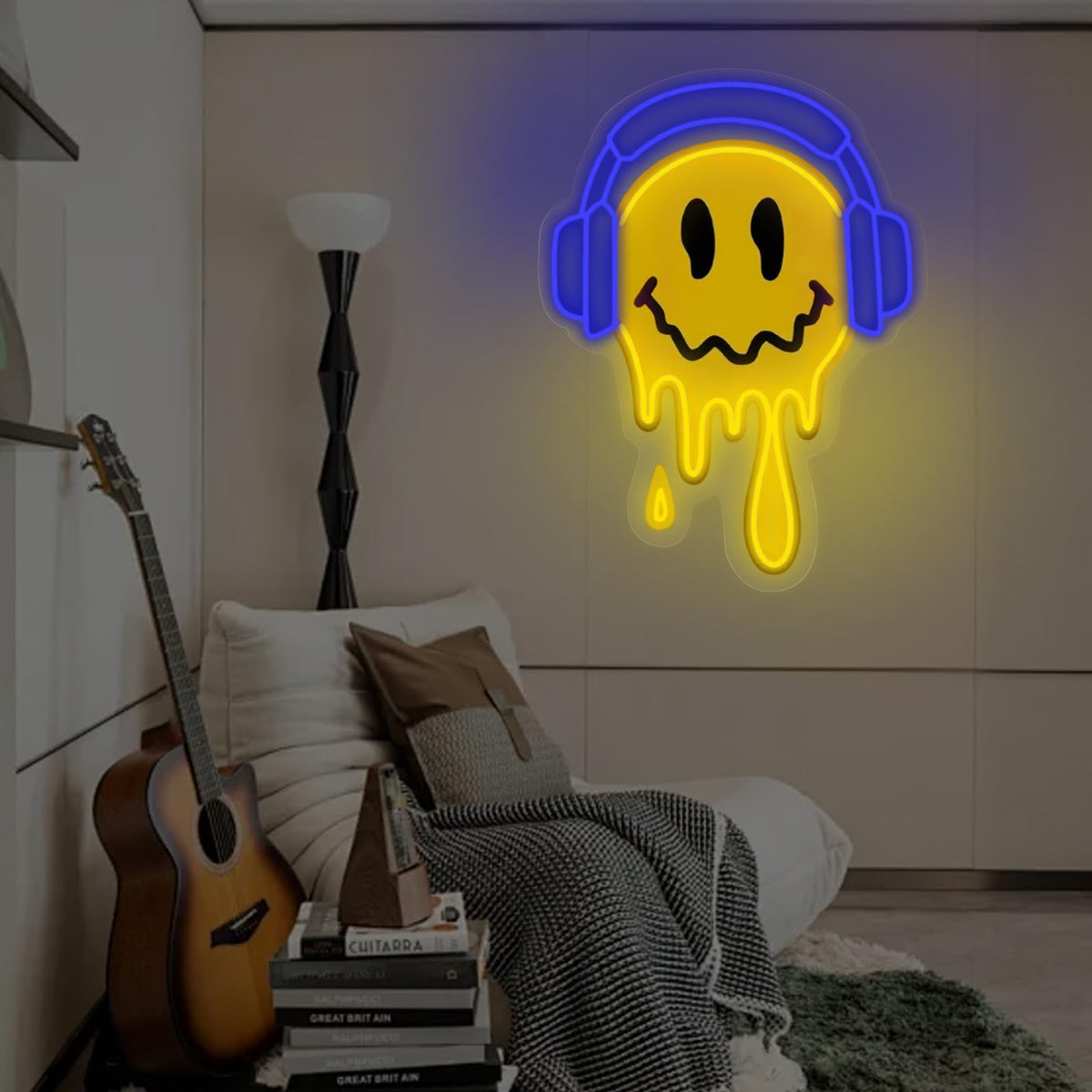 Melting Smile Face With Headphone Neon Sign For Wall Decor Neon Smile Light Signs For Kids Room Bar Party Bedroom Decor Lamp Personalized Gifts Kids Room Wedding Decoration Holiday Gift-Blue