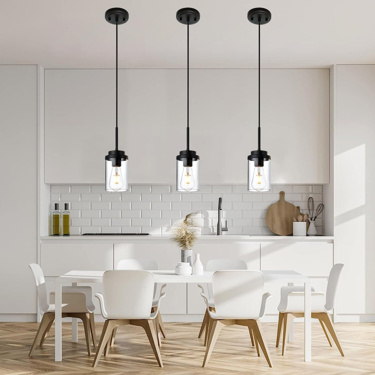 - **Modern Design**: Featuring a streamlined black metal round plate and dropping wire construction, these pendant lights are accented with elegant cylinder glass shades. Their minimalist design adds a touch of sophisticated charm, making them a perfect fit for contemporary interiors.