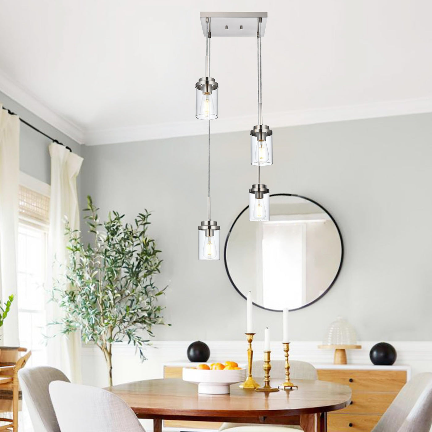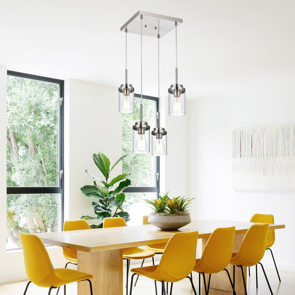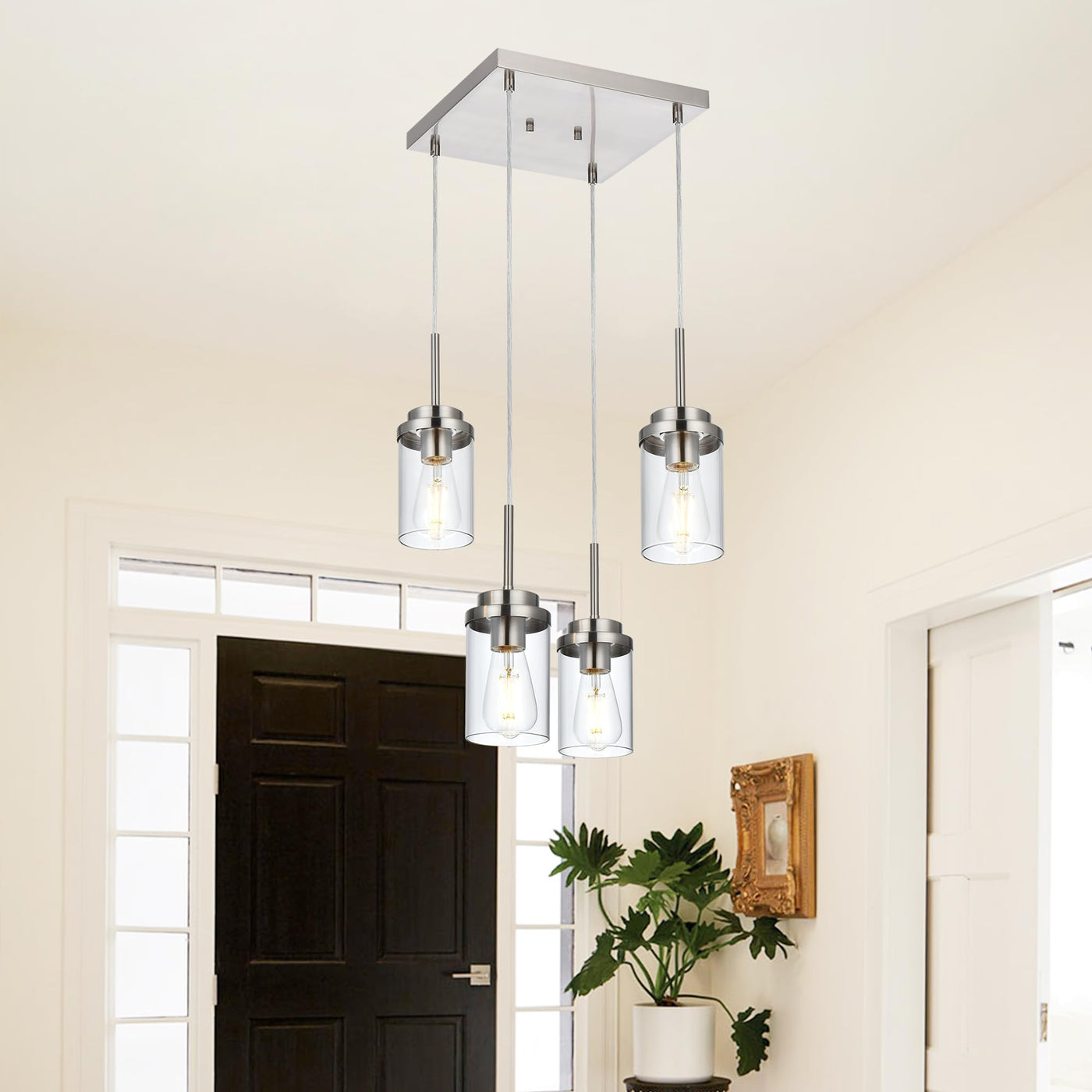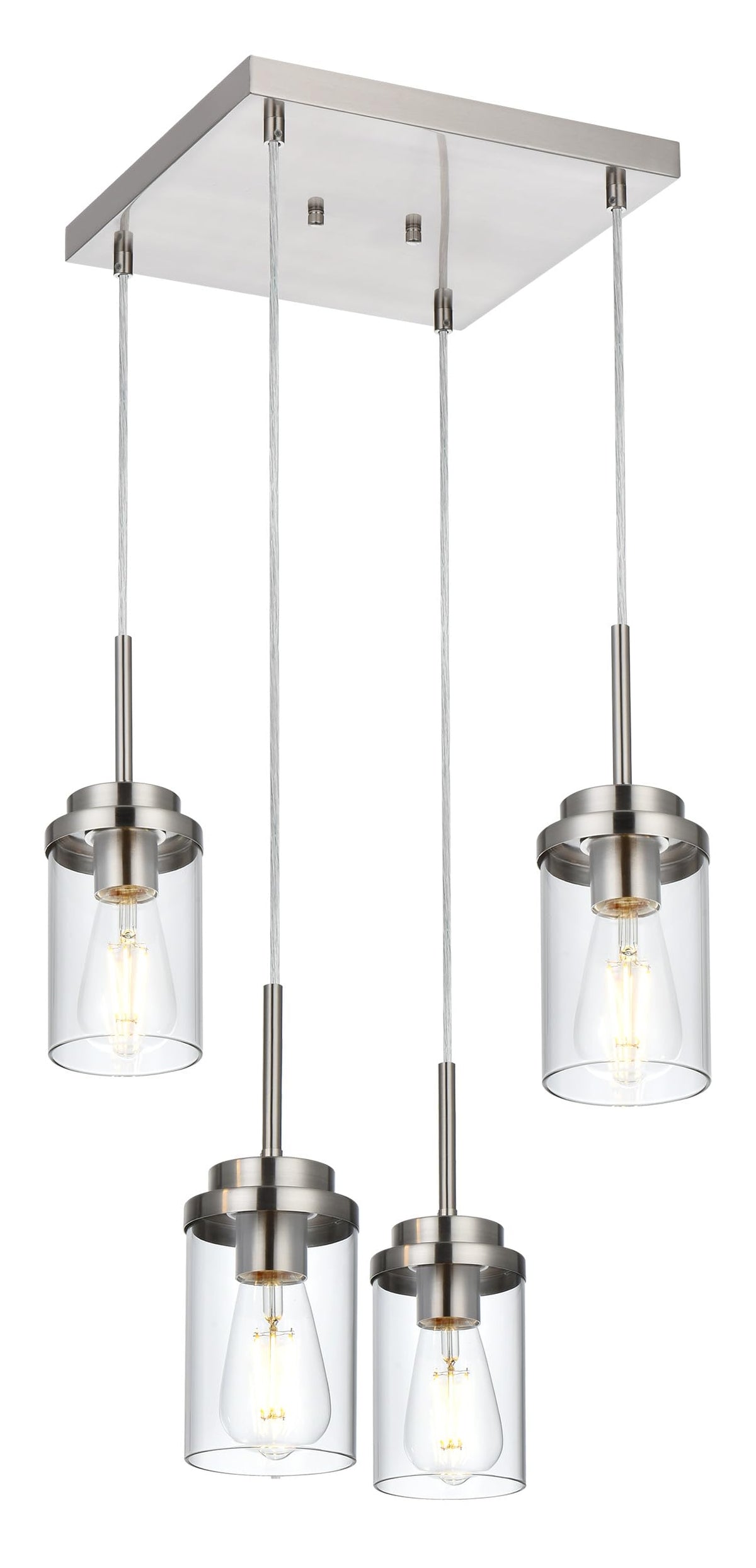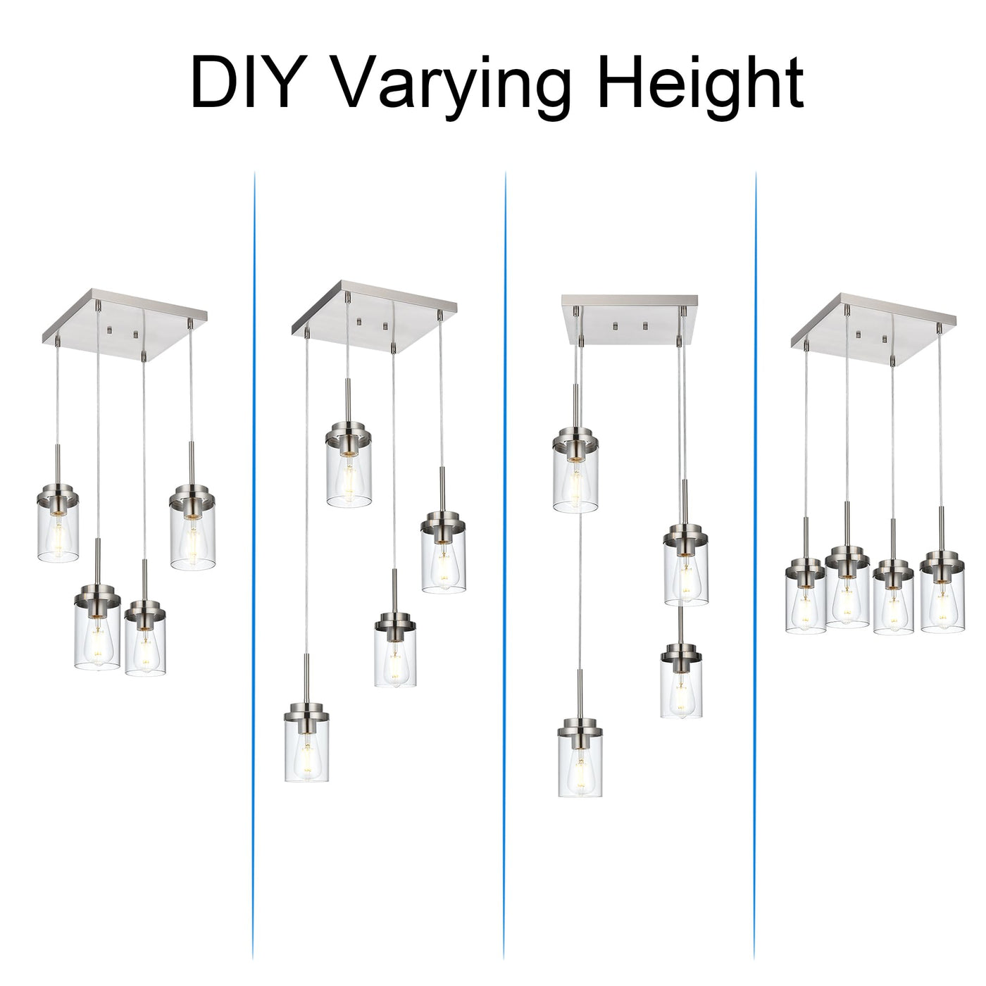 - **Sleek Modern Design**: Featuring a streamlined brushed nickel metal square plate and dropping wires, this pendant light showcases four exquisite cylinder glass shades. Its linear design breaks traditional lighting concepts, adding a touch of classy sophistication to your decor.