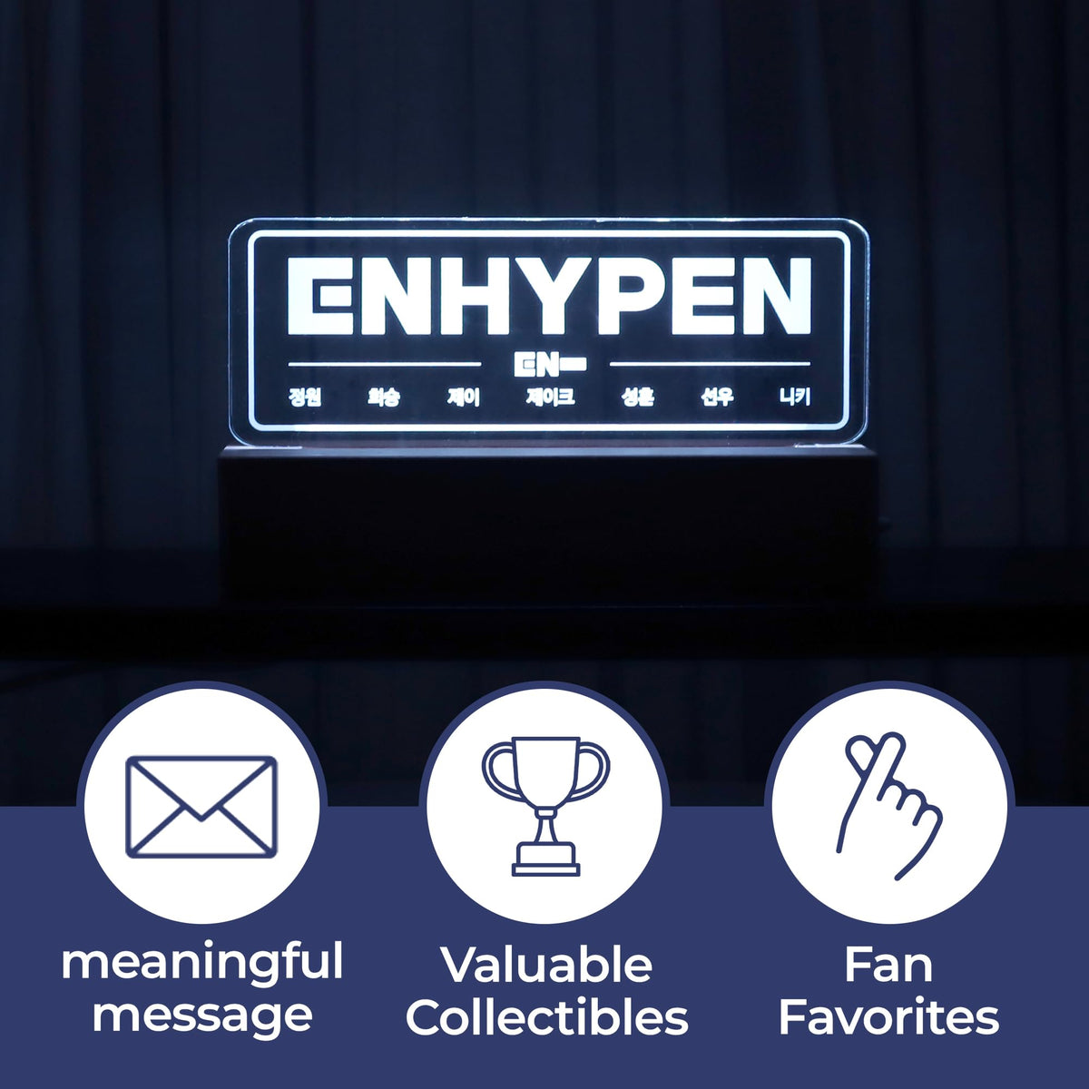 Crafted from enhanced acrylic and wood materials, the MEMELIGHT Kpop Lamp features a custom-engraved design that highlights your love for Enhypen. The multicolor lighting options allow for customizable brightness, enabling you to create the ideal ambiance whether you are studying, relaxing, or celebrating. This lamp seamlessly fits into any room decor, making it an excellent addition to bedrooms, dorm rooms, or creative spaces. Its stylish and functional attributes make it an ideal gift for fellow ENGENEs, suitable for birthdays, holidays, or any special occasion.