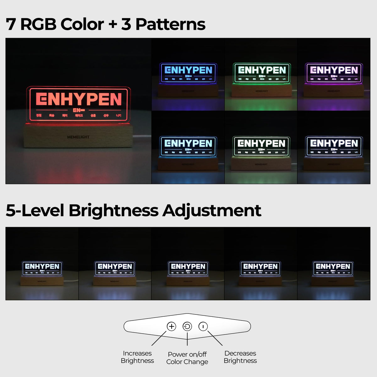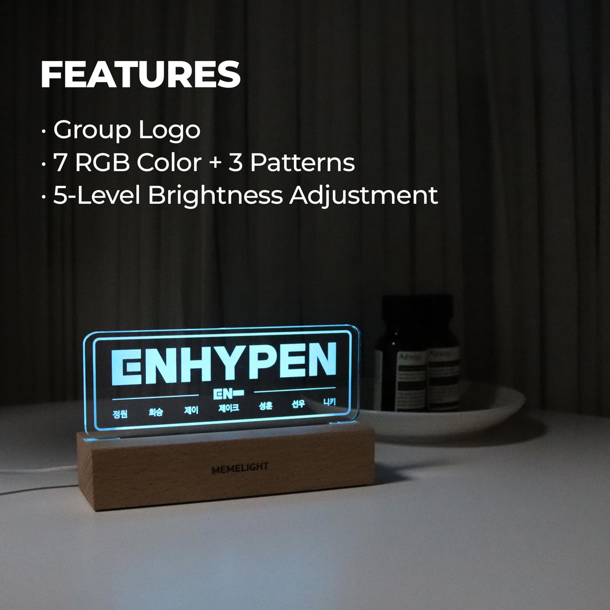 MEMELIGHT Enhypen Night Light Lamp, 7 RGB Colors, Dimmer, 8.3 x 4.2 x 1.7 inches, Wooden, Kpop Merchandise