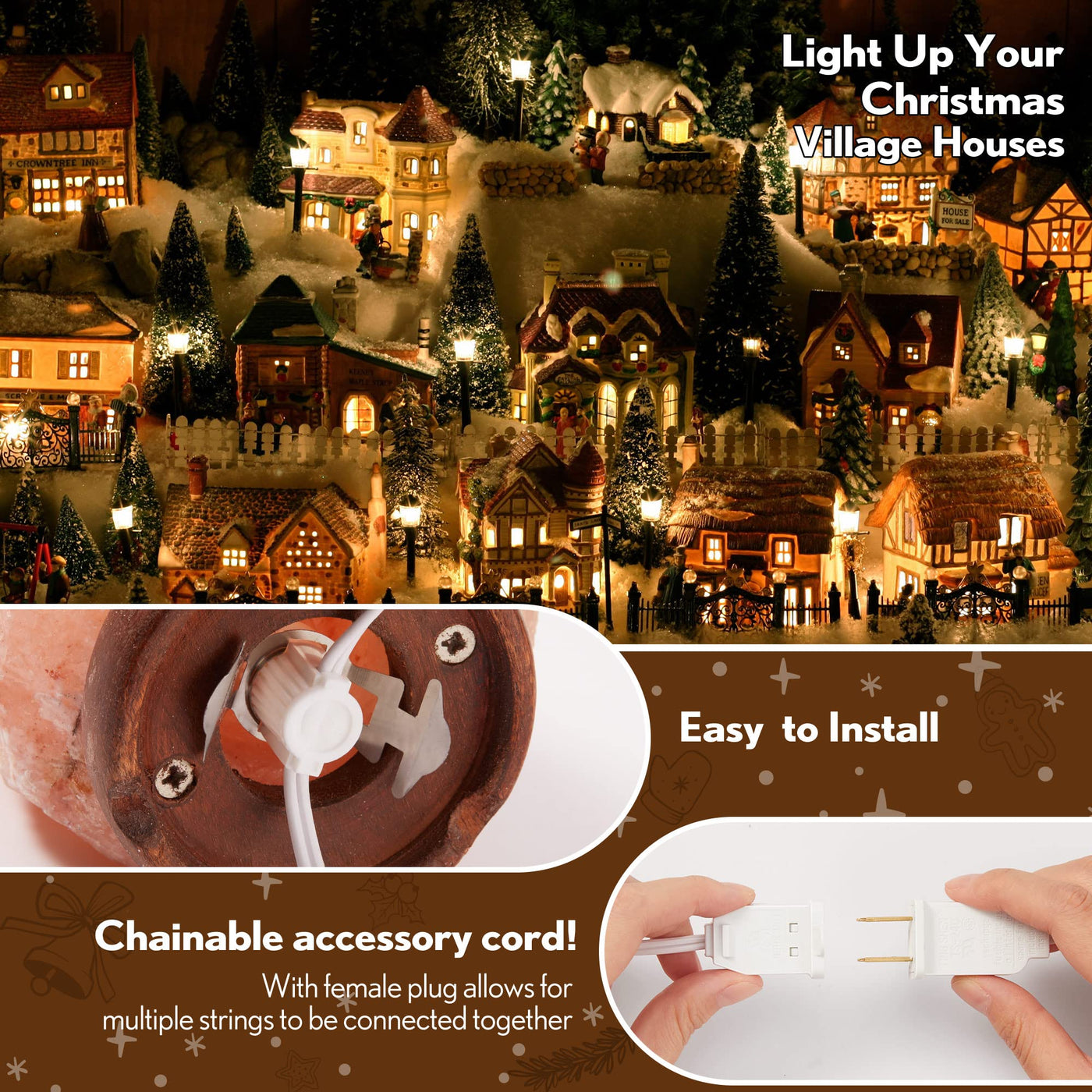 Enhance your holiday decorations with the 8.2FT UL-Listed Accessory Cord featuring 3 LED Light Bulbs, designed specifically for blow mold displays, ceramic houses, trees, and various craft projects. This accessory cord offers a warm white glow, creating an inviting atmosphere for any festive occasion.
