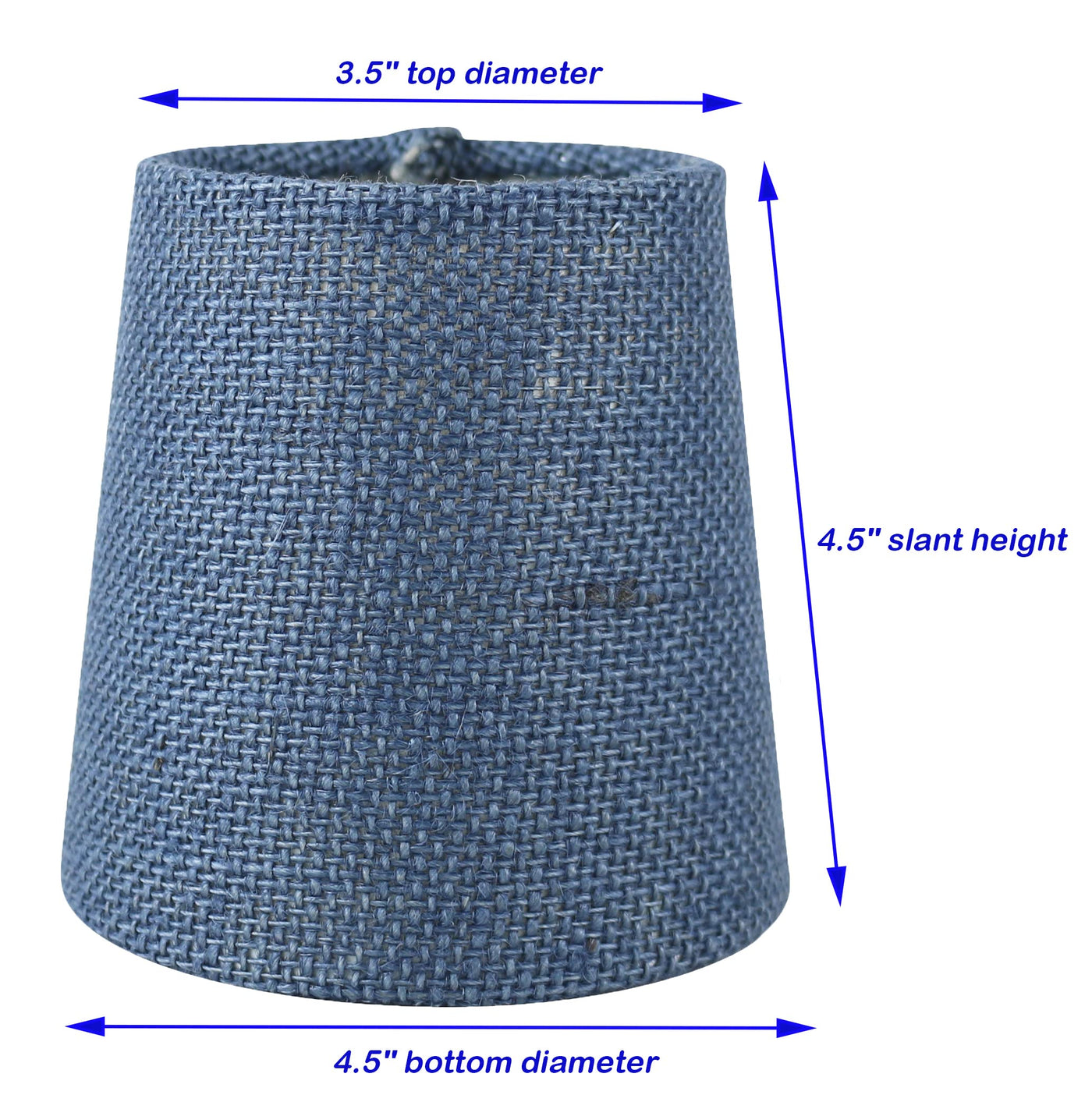 Q: What are the dimensions of the Meriville burlap chandelier lamp shades?A: The Meriville burlap chandelier lamp shades have a top diameter of 3.5 inches, a bottom diameter of 4.5 inches, and a height of 4.5 inches.