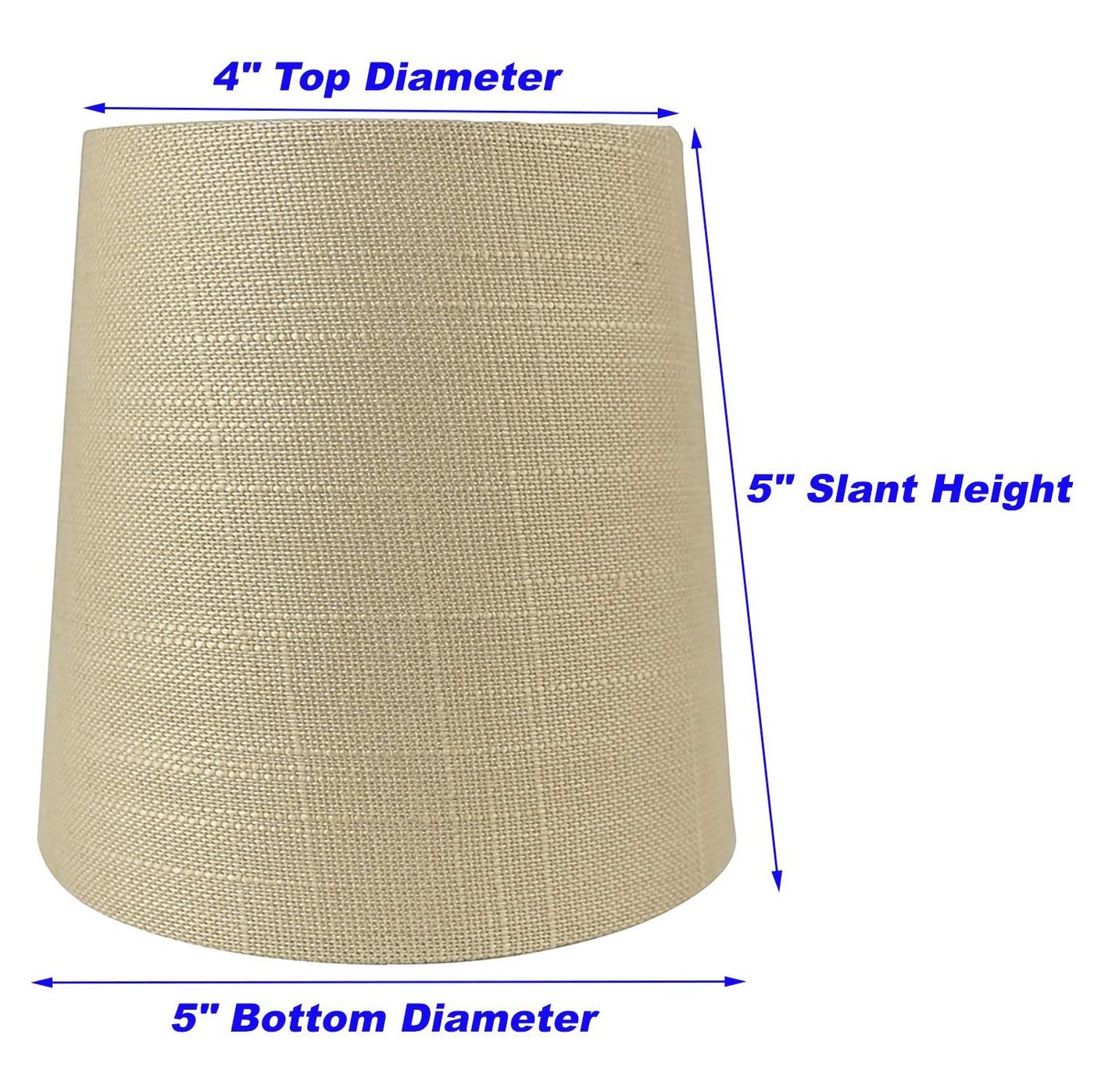 SHADES DIMENSIONS: 4" top diameter, 5" bottom diameter, and 5" height. FABRIC: Linen. Hardback FITTER: Clip-on fitter designed to fit teardrop or torpedo candelabra bulbs. NOT for standard regular light bulbs. SUGGESTED MAXIMUM WATTAGE: 40 watts.