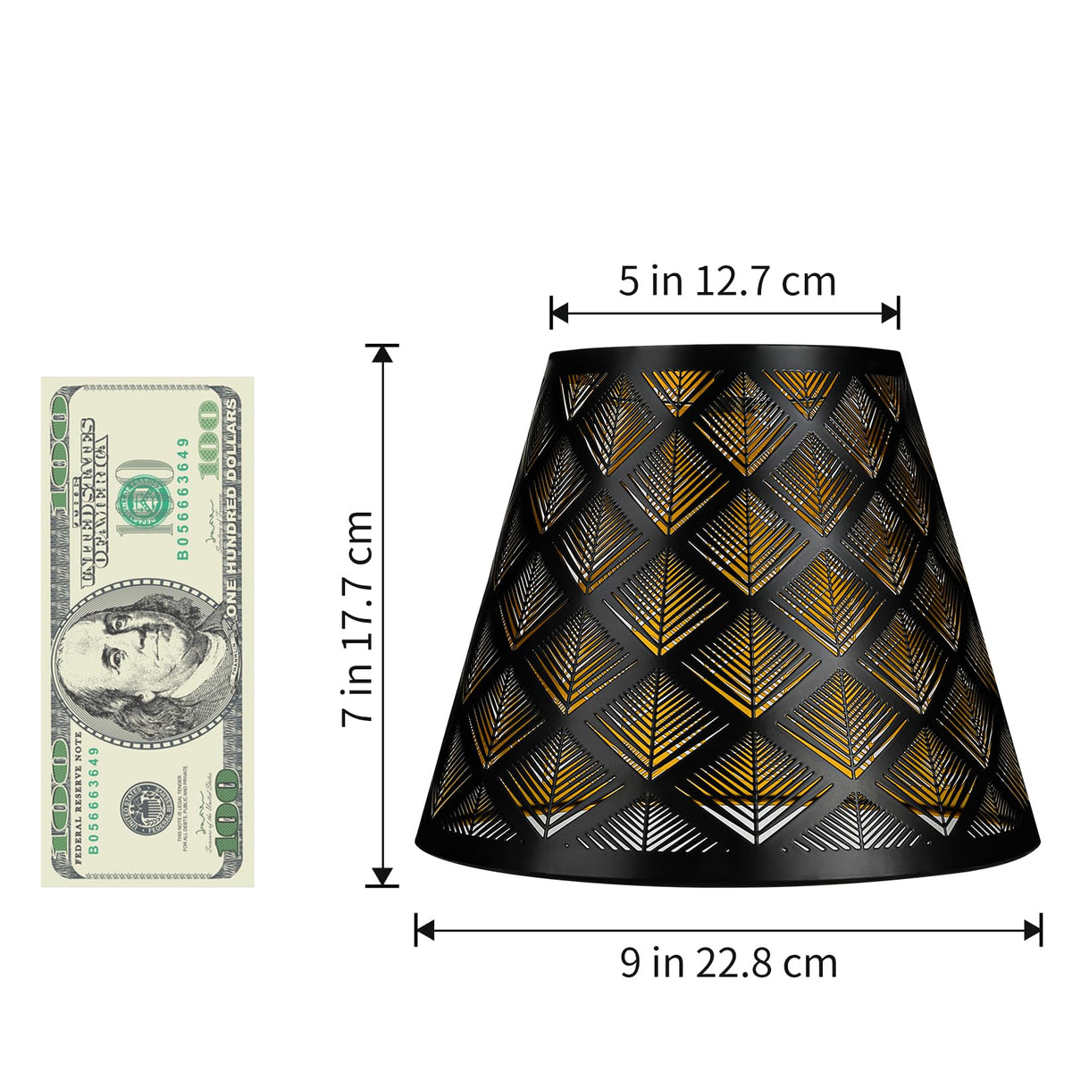 Q: What is the size of the Metal Small Lamp Shade?A: The Metal Small Lamp Shade has a top diameter of 5 inches, a bottom diameter of 9 inches, and a height of 7 inches, making it suitable for a lampshade holder that is 6 to 7 inches in height.