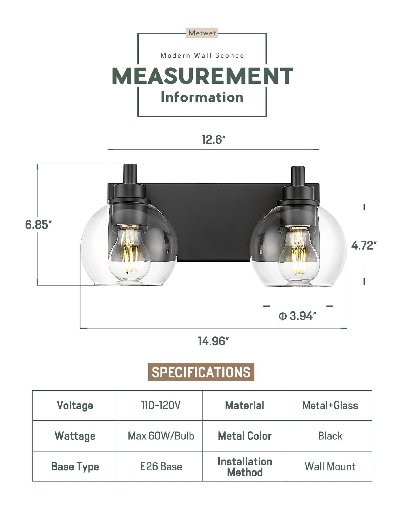 METWET 2 light bathroom light fixtures are the perfect combination of clear glass globe shades and matte black metal backplates. This classic pairing seamlessly blends with modern minimalist home decor. The cute round glass shades are thick and clear, while the wide rectangular metal backplates provide durability and sturdiness. METWET vanity light fixtures are designed to enhance the overall ambiance of your bathroom while providing ample illumination. The combination of clear glass and metal creates a harmonious and sophisticated look that complements any interior design style. Featuring a timeless and stylish design, METWET bathroom vanity light fixtures are visually appealing and will never go out of style. Experience the perfect blend of functionality and aesthetic appeal with our bathroom vanity light fixtures. These vanity light fixtures are the ultimate choice for your bathroom lighting needs. - Number of Items: 1 Pack - Finish: Matte Black - Material: Metal and Clear Glass - Overall: 14.96'' x 6.85'' x 3.54'' (L x W x H) - Back Plate: 12.6'' x 4.72(L x W) Return Policy: If the product you received with any damage or defect, please don't hesitate to contact us, return, replacement, or full refund will be issued within 24 hours.