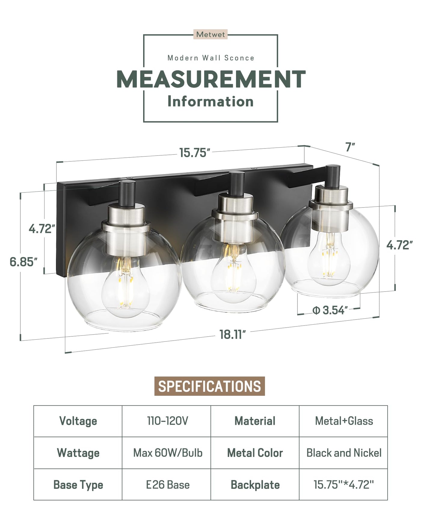 METWET 3-light bathroom light fixtures are the ideal combination of globe clear glass shade and matte black and brushed nickel metal backplates. The design of this bathroom lighting fixtures over mirror enables installation in either an upward or downward orientation. - Number of Items: 1 Pack - Finish: Brushed Nickel and Matte Black - Material: Metal and Clear Glass - Overall: 18.11'' x 7'' x 6.85'' (L x W x H) - Back Plate: 15.75'' x 4.72''(L x W)