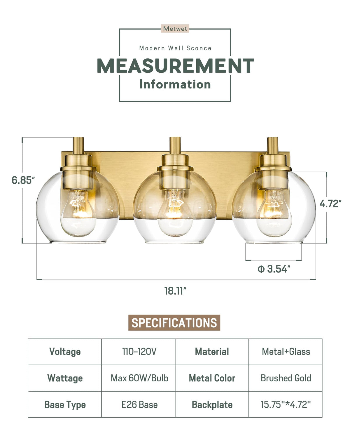 Metwet Bathroom Light Fixtures, 3-Light Brushed Gold Vanity Light, Modern Wall Sconces With Clear Glass Globe Shade, Bathroom Wa