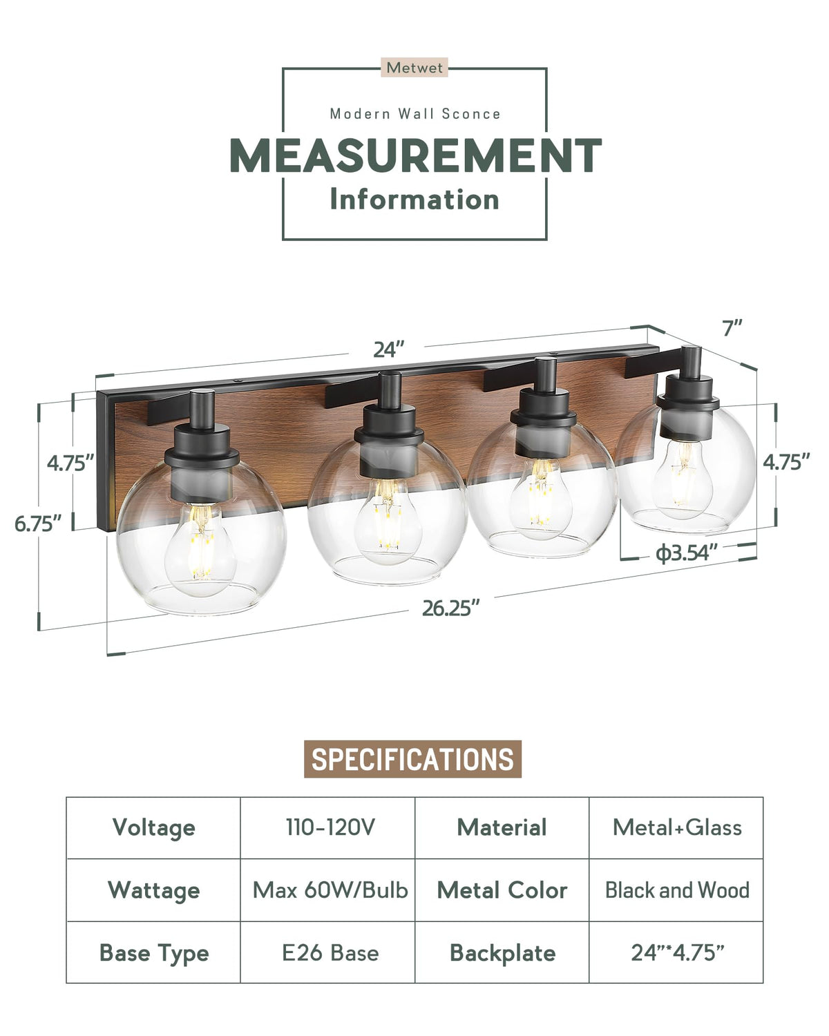 METWET 4-light bathroom light fixtures are the ideal combination of globe clear glass shade and matte black and faux-wood metal backplates. The design of this bathroom lighting fixtures over mirror enables installation in either an upward or downward orientation. - Number of Items: 1 Pack - Finish: Faux-Wood and Matte Black - Material: Metal and Clear Glass - Overall: 26.25'' x 7'' x 6.75'' (L x W x H) - Back Plate: 24'' x 4.75''(L x W)