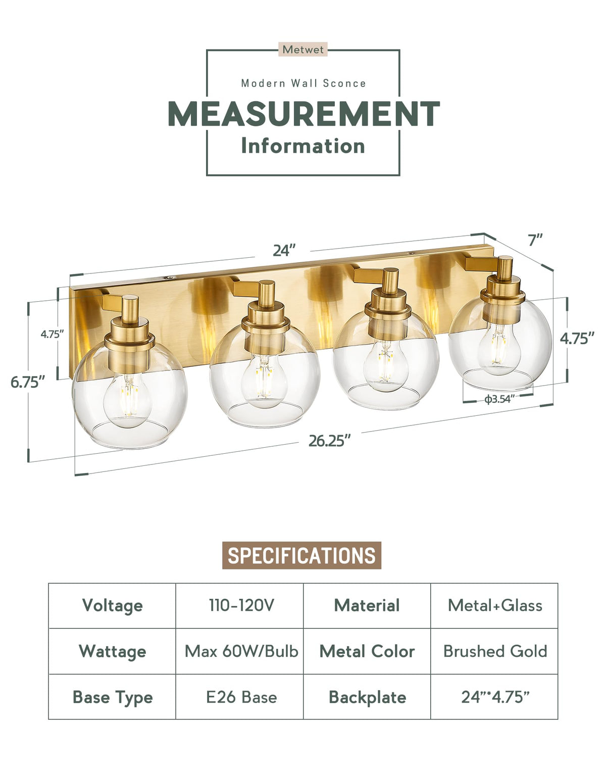 METWET 4-light bathroom light fixtures are the perfect combination of clear glass globe shades and brushed gold metal long base backplates. This classic pairing seamlessly blends with modern minimalist home decor. The globe round glass shades are thick, while the wide rectangular metal backplates provide durability and sturdiness. METWET vanity lights for bathroom are designed to enhance the overall ambiance of your bathroom while providing ample illumination. The combination of clear glass and metal creates a harmonious and sophisticated look that complements any interior design style. Featuring a timeless and stylish design, METWET bathroom vanity light fixtures are visually appealing and will never go out of style. Experience the perfect blend of functionality and aesthetic appeal with our bathroom vanity light fixtures. These vanity light fixtures are the ultimate choice for your bathroom lighting needs. - Number of Items: 1 Pack - Finish: Brushed Gold - Material: Metal and Clear Glass - Overall: 26.25'' x 7'' x 6.75'' (L x W x H) - Back Plate: 24'' x 4.75''(L x W) If the product you received with any damage or defect, please don't hesitate to contact us, return, replacement, or full refund will be issued within 24 hours.