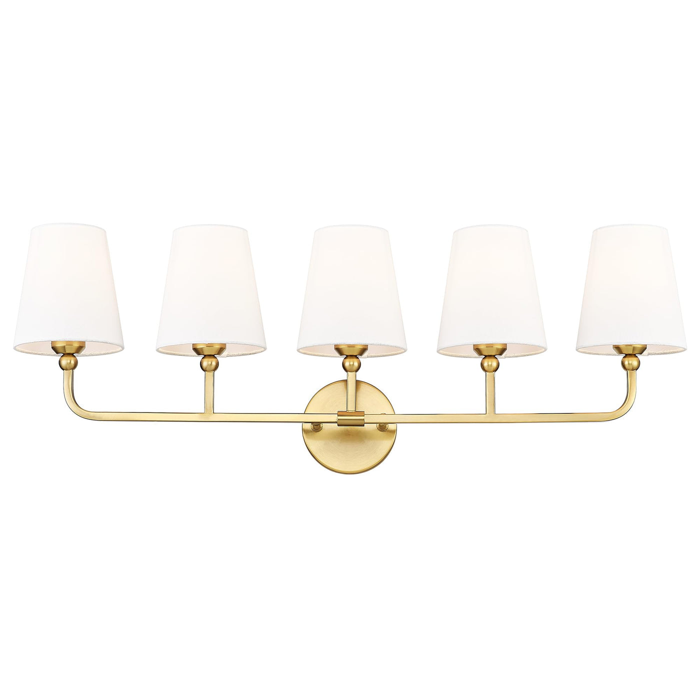 The METWET 5 Light Brushed Gold Wall Sconces, are a ideal addition to your bathroom vanity lighting. With a brushed brass finish and a white fabric shade, these classic yet modern sconces will add a touch of elegance to any space. SPECIFICATIONS - Finish: Brushed Gold - Material: Metal and Fabric - Overall: 34.75'' x 7.5'' x 12.25''(L x W x H) - Back Plate: 4.75'' Dia Explore the METWET 837 Fabric Shade Light Series, which includes various colors of double wall sconce, 3-light bathroom light fixtures, 4-light bathroom vanity lights, 5-Light vanity lighting fixtures and 5-light kitchen Island lighting to suit your various space needs. Unleash your creativity and define its ideal use in any setting.