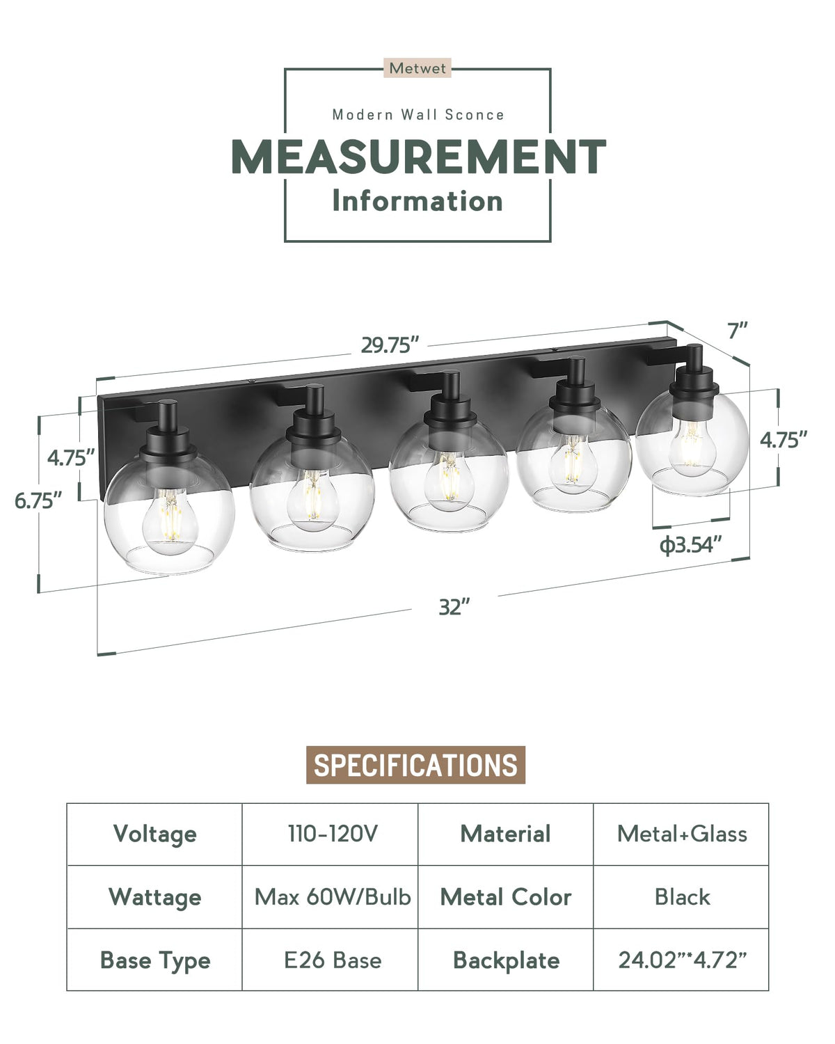 METWET 5-light bathroom light fixtures are the perfect combination of clear glass globe shades and matte black metal long base backplates. This classic pairing seamlessly blends with modern minimalist home decor. The globe round glass shades are thick, while the wide rectangular metal backplates provide durability and sturdiness. METWET vanity lights for bathroom are designed to enhance the overall ambiance of your bathroom while providing ample illumination. The combination of clear glass and metal creates a harmonious and sophisticated look that complements any interior design style. Featuring a timeless and stylish design, METWET bathroom vanity light fixtures are visually appealing and will never go out of style. Experience the perfect blend of functionality and aesthetic appeal with our bathroom vanity light fixtures. These vanity light fixtures are the ultimate choice for your bathroom lighting needs. - Number of Items: 1 Pack - Finish: Matte Black - Material: Metal and Clear Glass - Overall: 32'' x 7'' x 6.75'' (L x W x H) - Back Plate: 29.75'' x 4.75''(L x W) If the product you received with any damage or defect, please don't hesitate to contact us, return, replacement, or full refund will be issued within 24 hours.