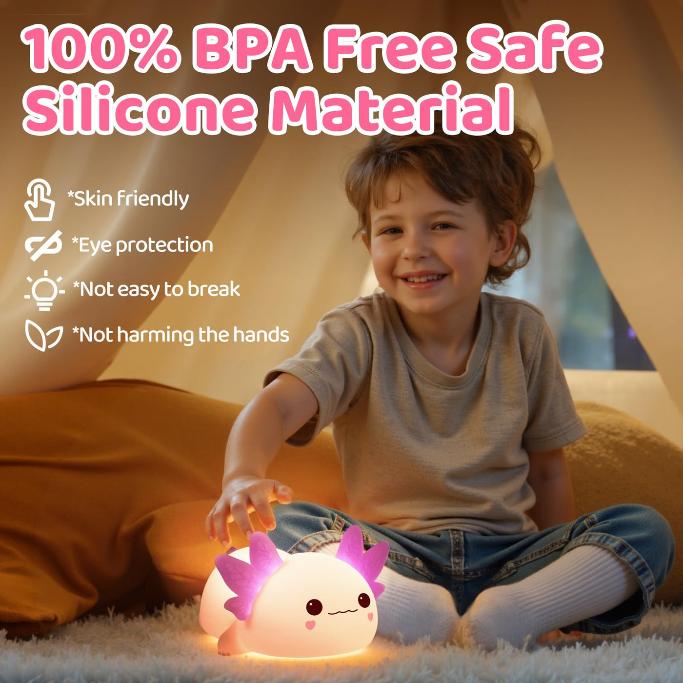 Introducing the Axolotl Night Light for kids, a delightful addition to any young adventurers room. This whimsical kids night light features an endearing axolotl design thats sure to capture the hearts of children and parents alike. Crafted with a soft silicone exterior, its safe, durable, and incredibly cuddly, making it perfect for little hands to hold and hug. The Axolotl Night Light isnt just cute; its also a practical sleep aid. It emits a warm, soothing glow that creates a calming atmosphere, ideal for helping kids relax and drift off to sleep. With multiple brightness settings, you can adjust the light to your childs preference, whether they need a dim, comforting light for bedtime stories or a brighter light for late-night explorations. This axolotl night light is more than just a source of illumination; its a friendly companion that provides a sense of security and comfort. The Axolotls playful smile and gentle light make it the perfect bedtime buddy, ready to chase away the dark and fill the room with a magical ambiance. The axolotl lamp is designed with care to meet the highest safety standards, ensuring its a reliable and cherished part of your childs nightly routine. Its not just a kids night light; its a cherished friend that promises sweet dreams and a fearless night.