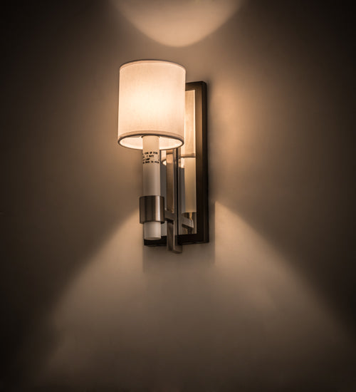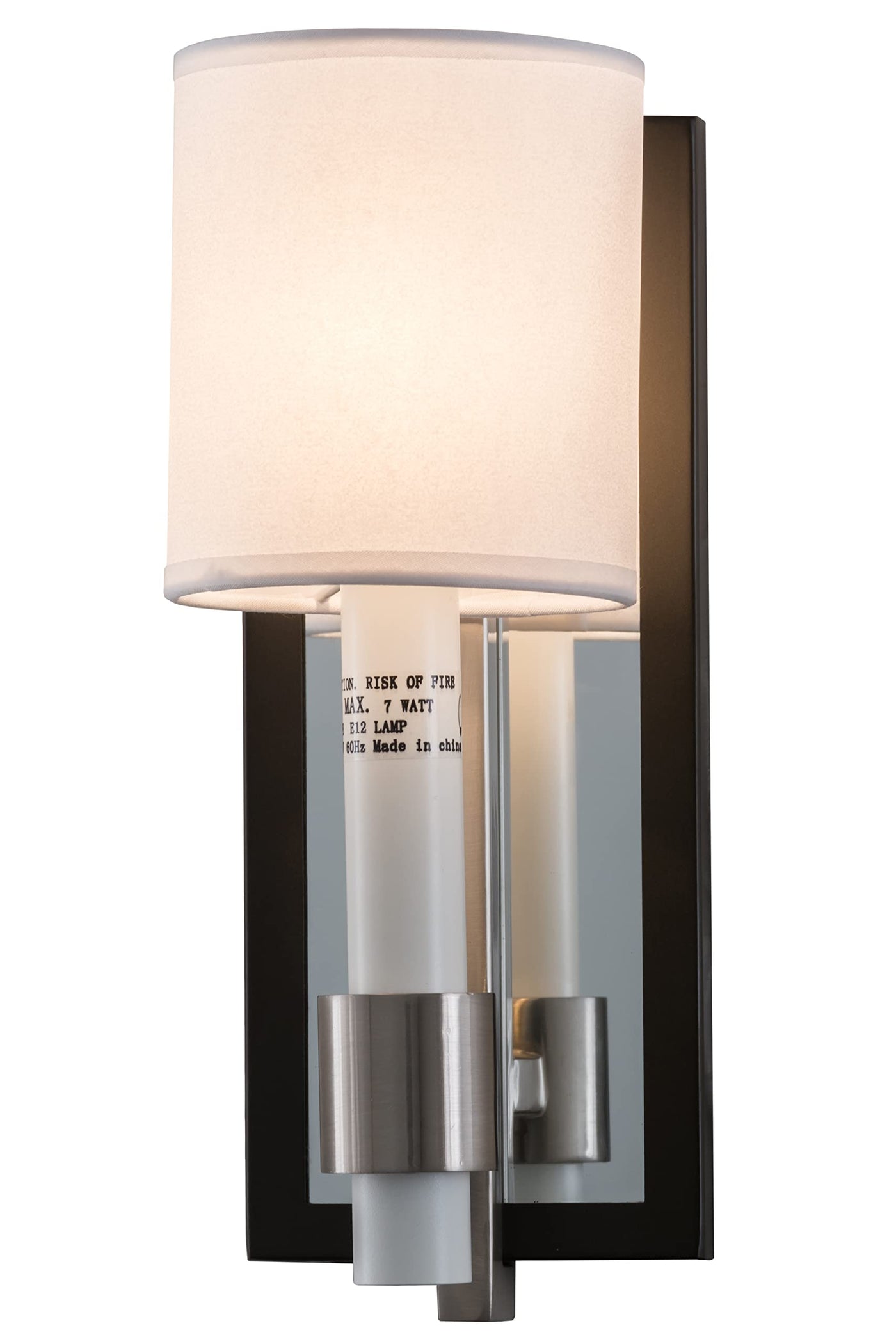Taking elegance to an entirely new level, Albertafeatures a White paper shade that crowns a bandedcylindrical lamp attached to an acrylic mirrorbackplate framed in Satin Nickel. This fixture isperfect for corridors and entryways in residential,hospitality and commercial interiors. FeaturesAlberta Wall SconceOne LightSpecificationsFinesh color: Pewter & Blackened Pewter & MirrorTheme: Lodge Fabric contemporaryFamily: AlbertaNumber of Bulb: 1Bulb Wattage: 7Bulb Type: candelabraDiemension: 11" H x 4" W x 6" DWeight: 2Ǒ lbs