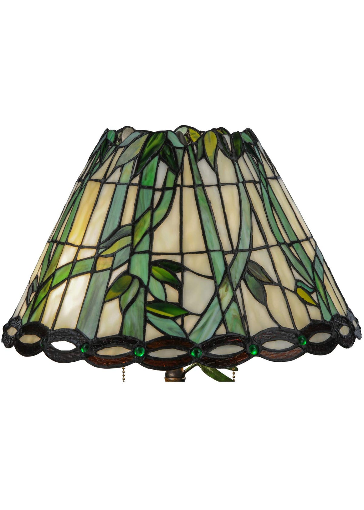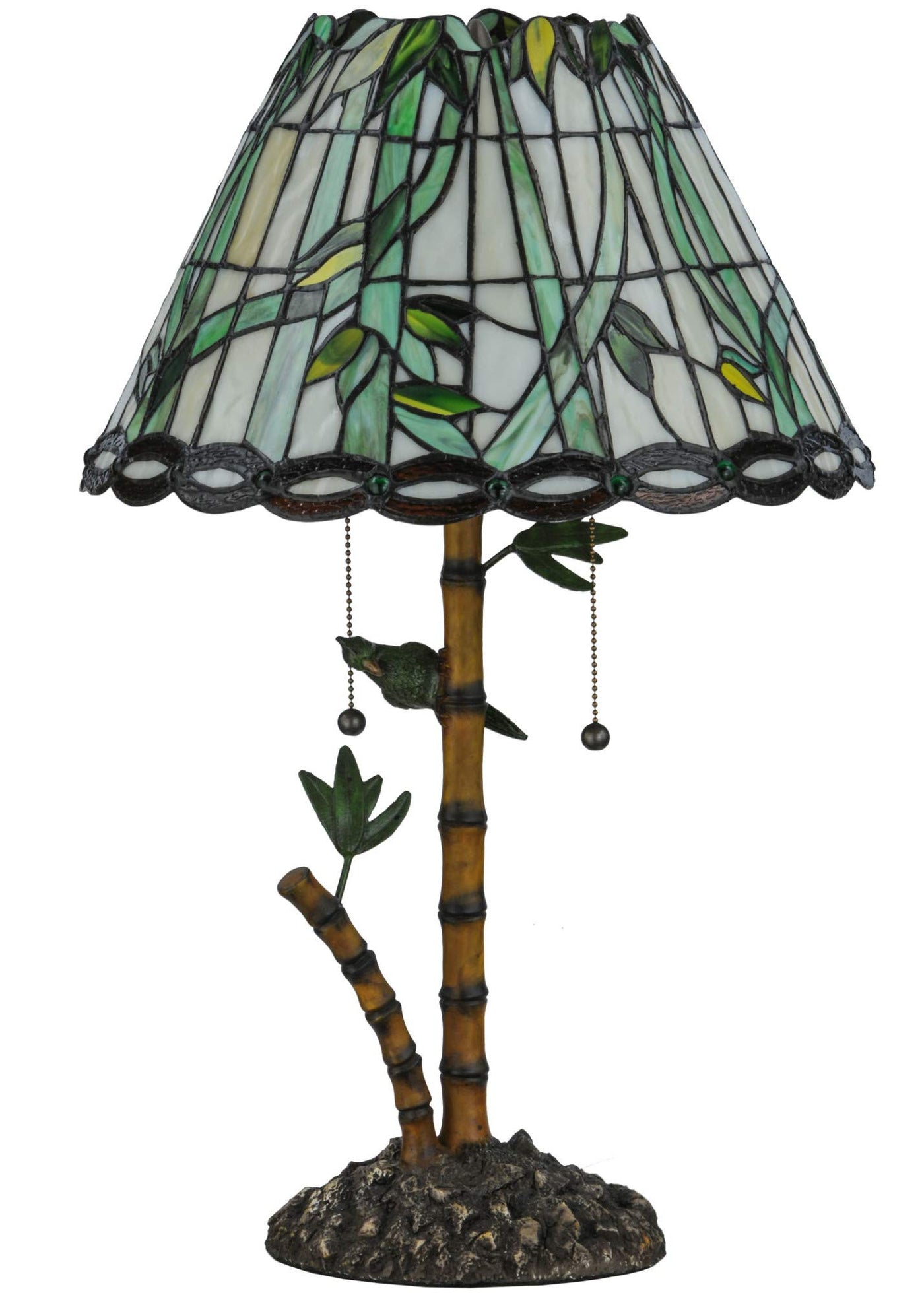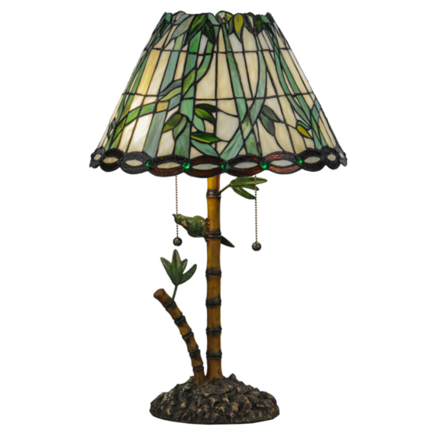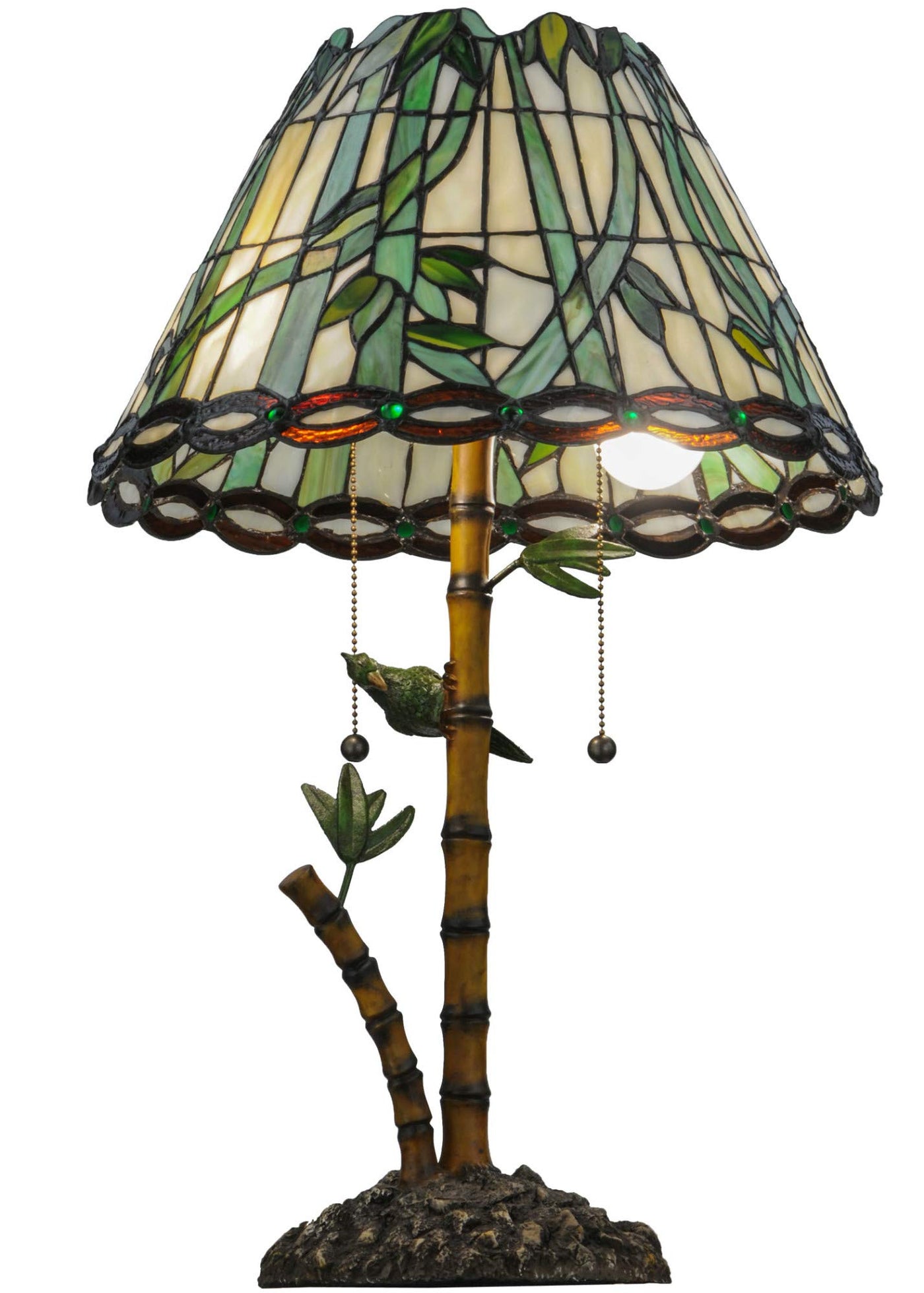Q: What materials are used in the construction of this table lamp?A: This table lamp features a combination of metal and stained art glass for the shade, along with a sturdy bronze base.