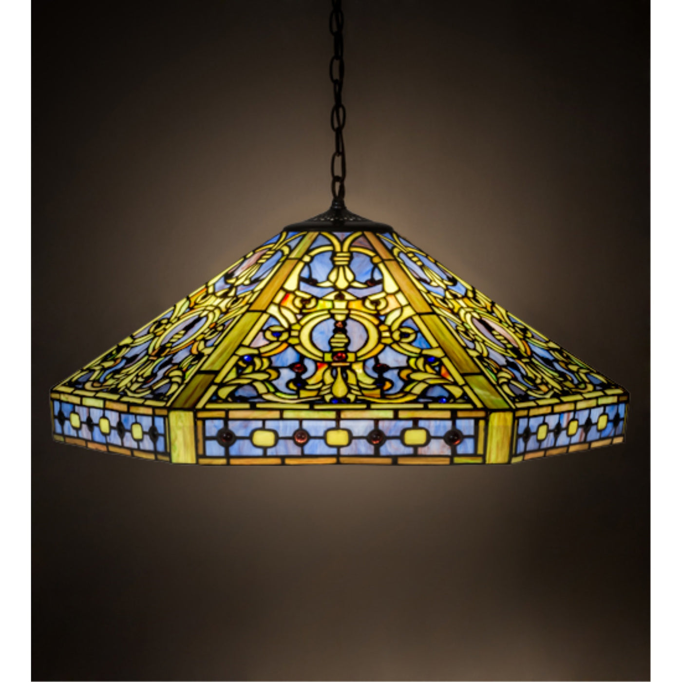 Q: What are the dimensions of the Tiffany 3 Light Elizabethan Pendant?A: The dimensions of the Tiffany 3 Light Elizabethan Pendant are as follows: Height: 15 inches, Maximum Height: 50 inches, and Width: 25 inches, making it a substantial fixture for various room sizes.