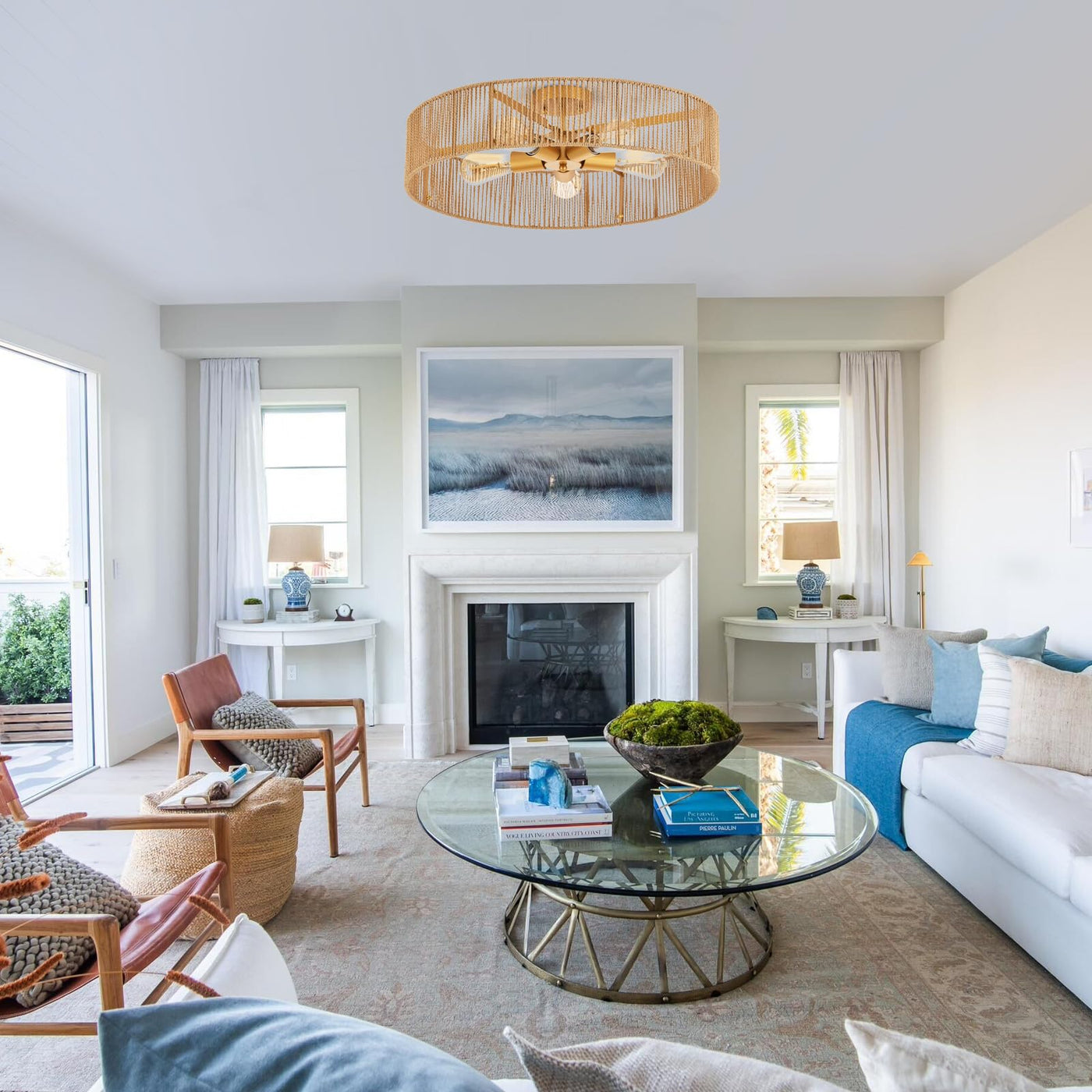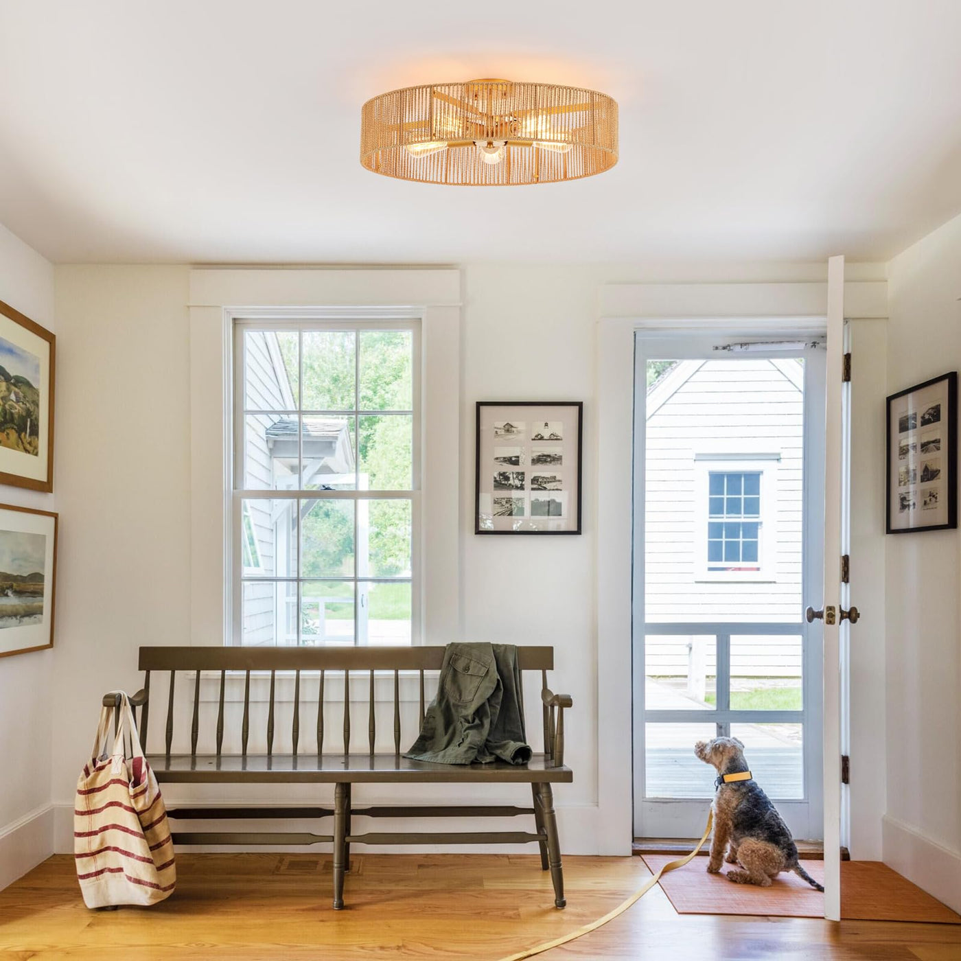 Mhytogn 24'' Natural Rattan Flush Mount Ceiling Light Fixture Antique Brass Brush Paint Finish Boho Chandelier For Porch Patio H