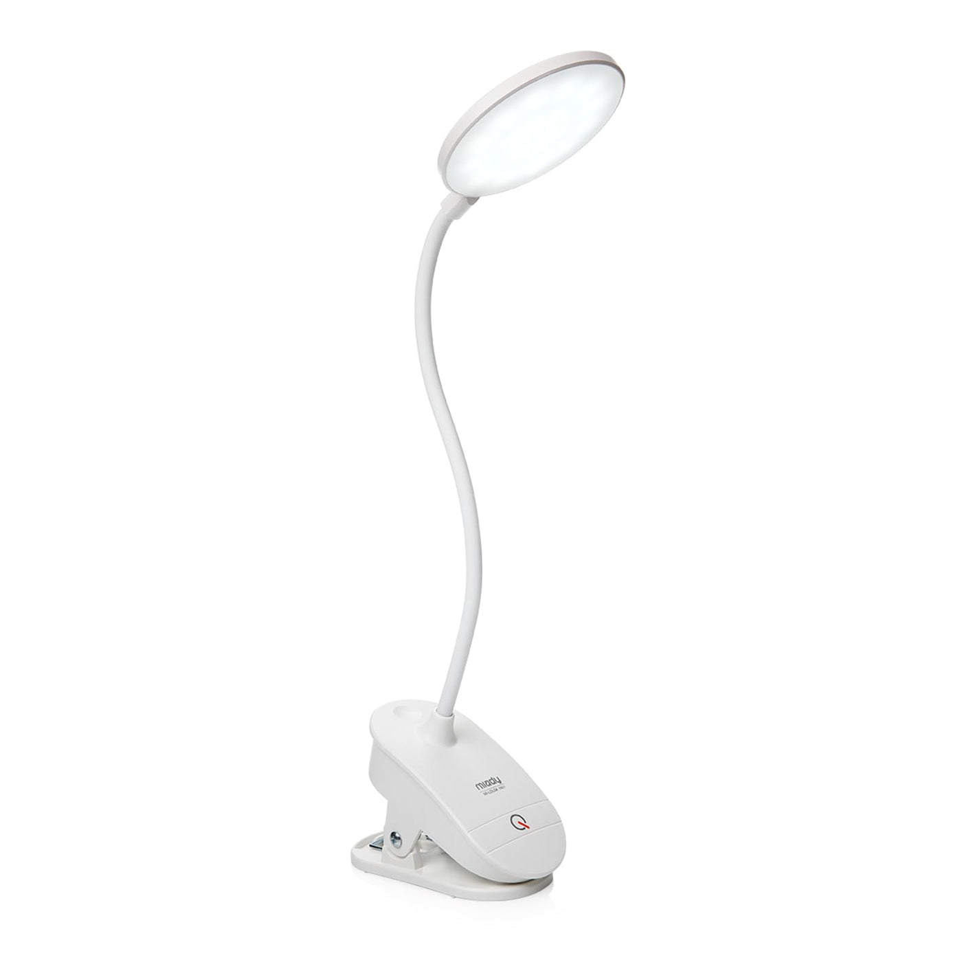 Miady Clip on Lamp - USB Rechargeable Battery Powered Light with 3 Brightness Levels, White, Perfect for Reading and Bed Use, 1 Pack