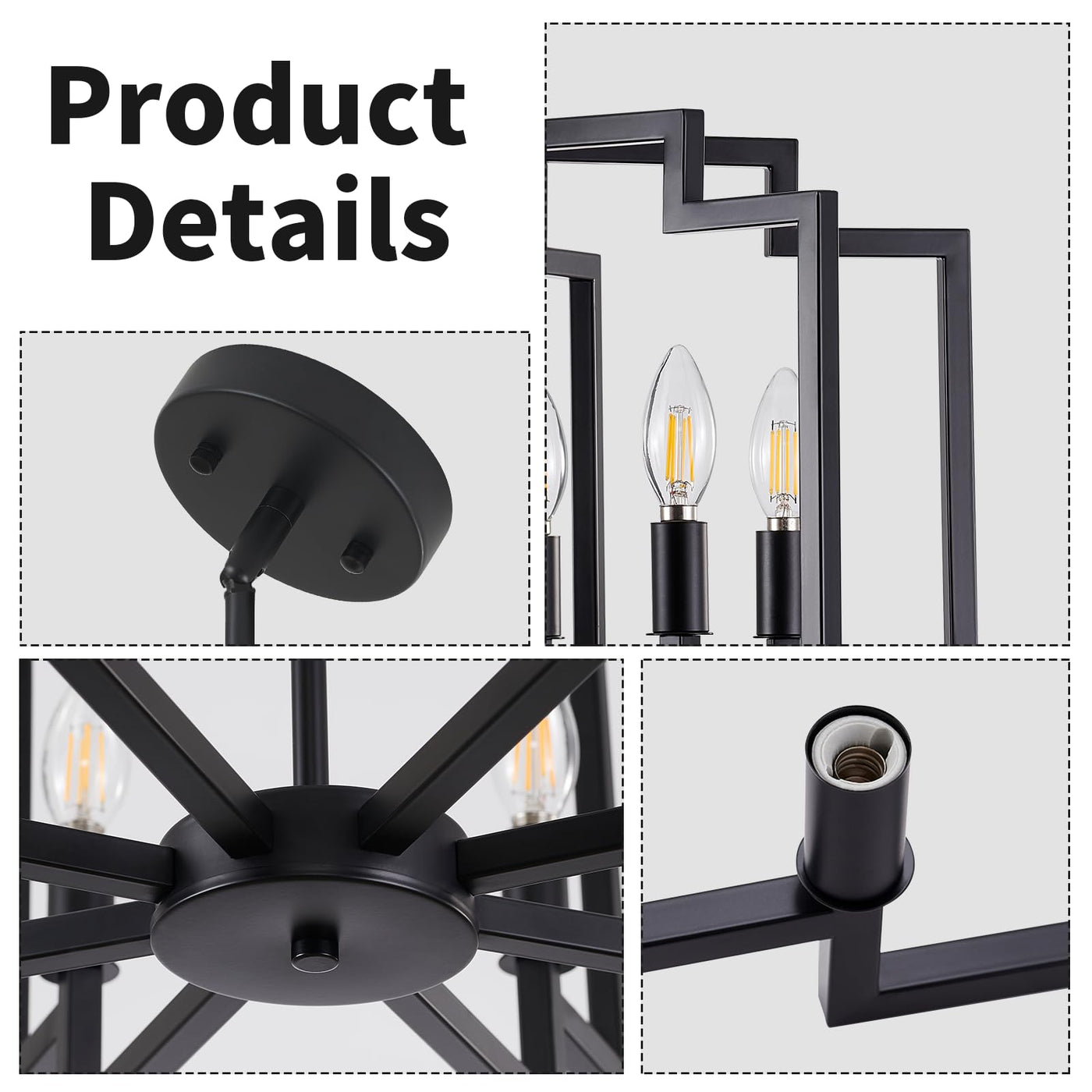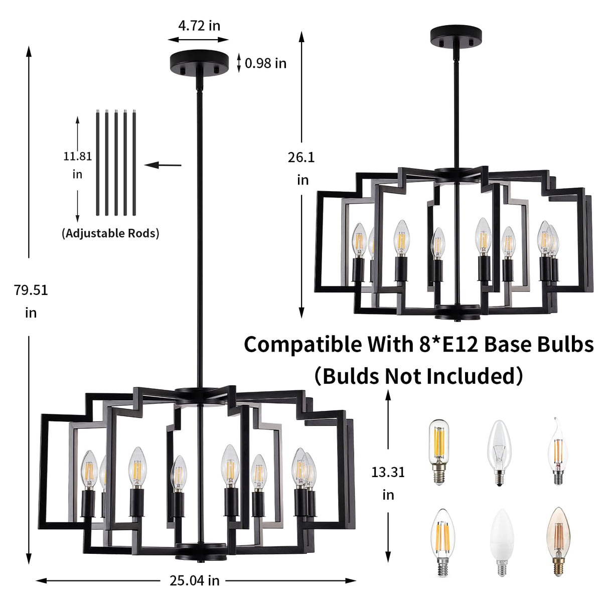 The dining room light fixture uses a simple black frame to construct stylish shapes and light effects, bringing uniqueness and chicness to the room. Black chandelier is suitable for a wide range of home styles (modern/retro/farmhouse), ideal for bedrooms, kitchens, dining rooms, living rooms, dens, balconies, farmhouses, foyers, entrances, hallways and more. Diameter: 25.04 inch Height: 75.51 inches Pendant poles: 5*11.81 inch Chandelier is compatible with 8* E12 base bulbs (bulbs not included)