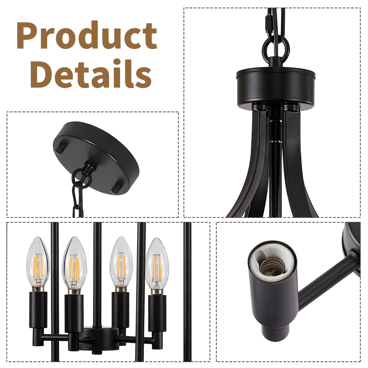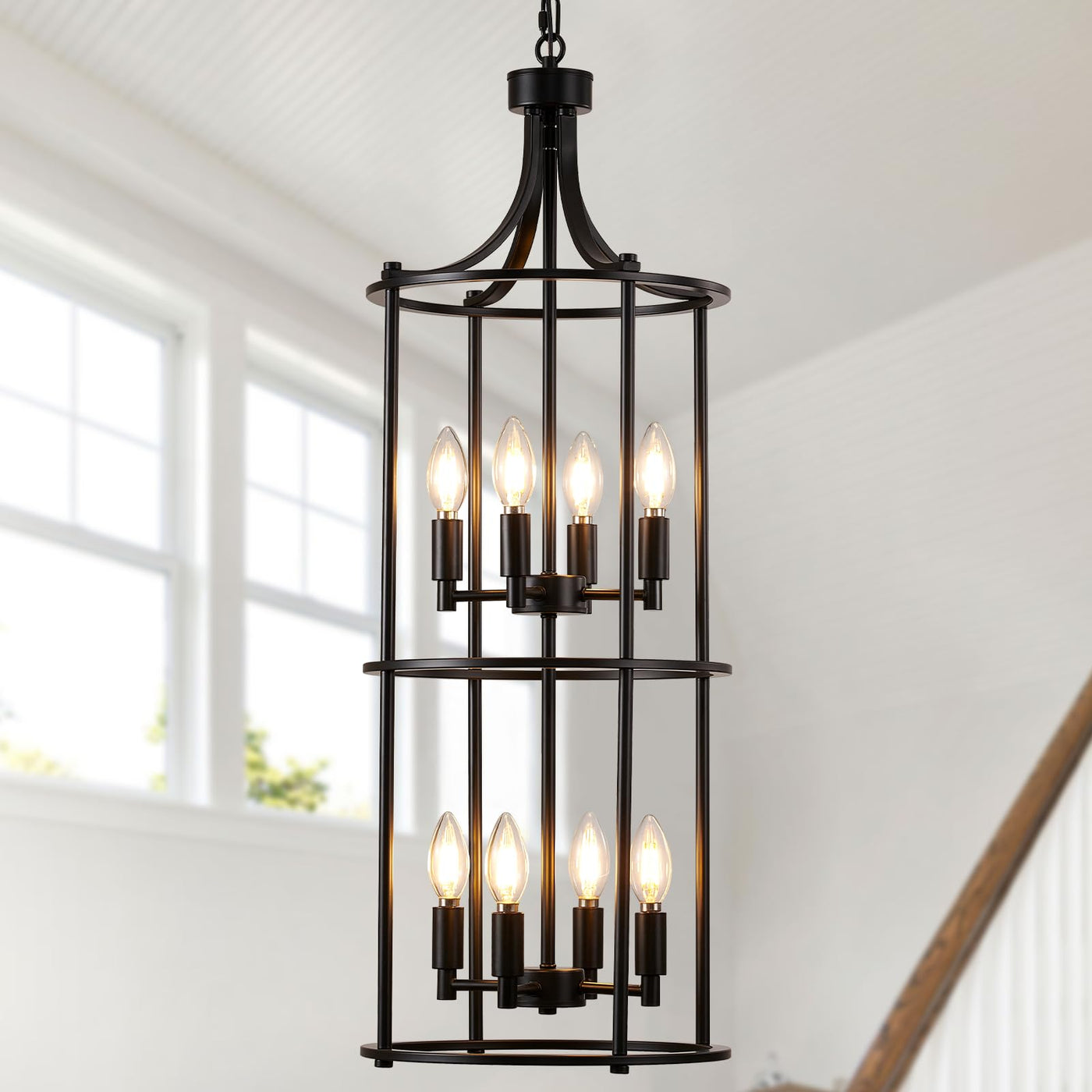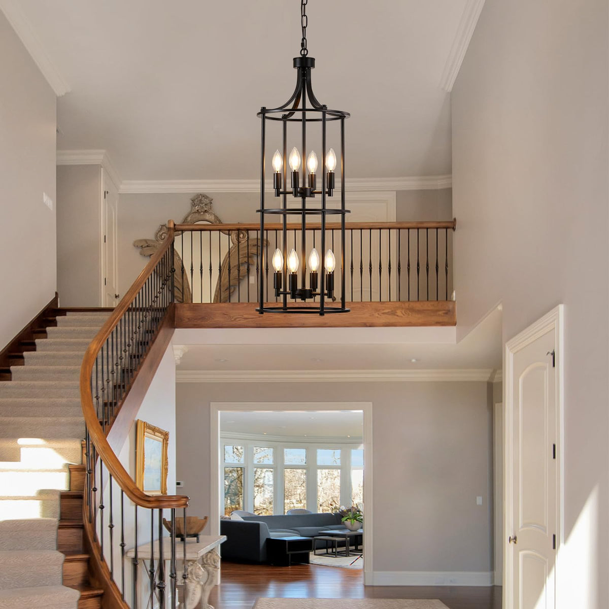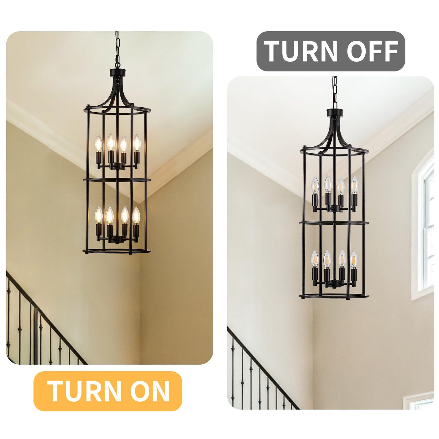 The black chandelier for foyer light features a tiered cage design with a unique and stylish look, creating a rustic yet modern atmosphere for your room. The matte black foyer chandeliers for high ceilings meets the new popular style and can be the focal point of any area. Product Details Size: 11.81*11.81*90.55 inch The black dining room chandelier is compatible with any E12 base bulb (Bulbs Not Included)