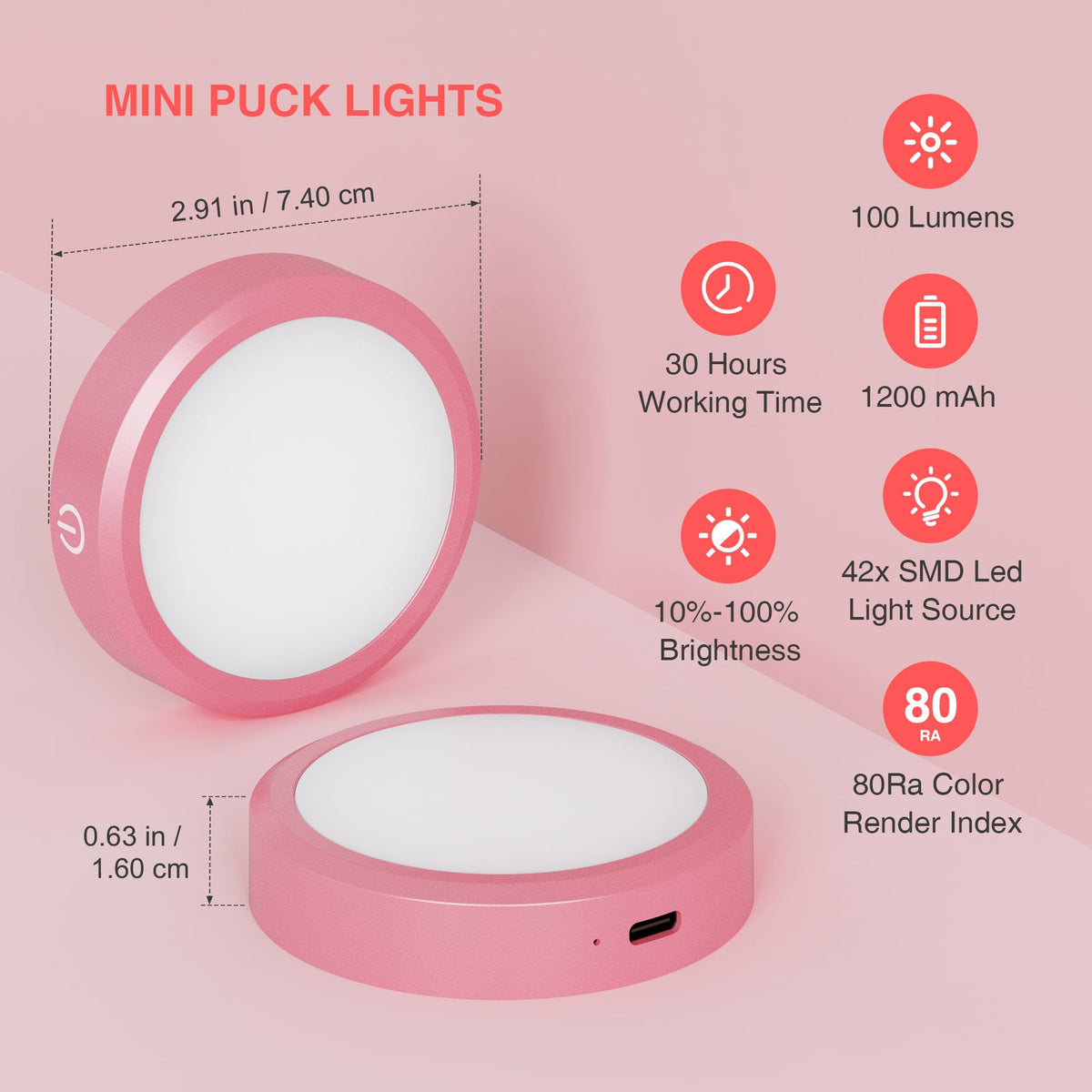 MICLIONLED Rechargeable Puck Lights, LED Under Cabinet Light, Wireless, 3 Color Temperatures, 2 Pack, Pink, Model M3-GB17