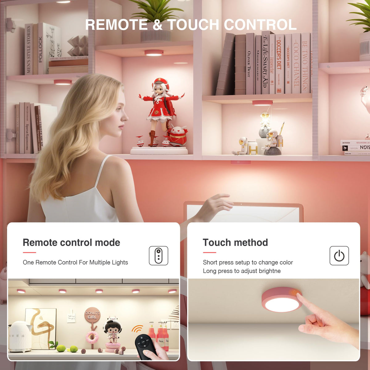 Q: Can I adjust the brightness and color temperature remotely?A: Yes, the puck lights allow you to adjust the brightness and switch color temperatures through the remote control, providing convenient customization from a distance.