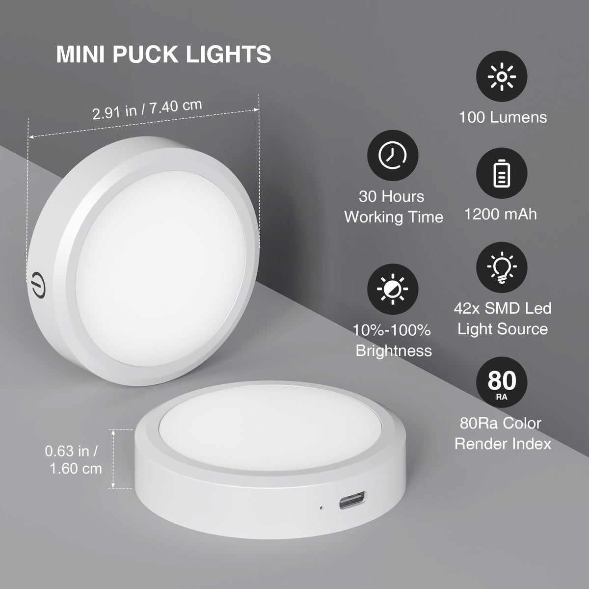 Q: How do I charge the Rechargeable Puck Lights?A: The puck lights come with a two-in-one Type-C fast charging cable, allowing you to recharge them in approximately two hours.