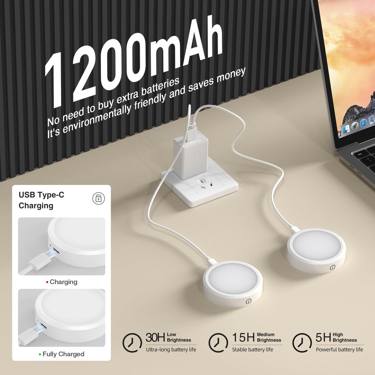 Crafted from well-made plastic, these puck lights boast a unique full-screen design that incorporates 42 LED beads. This design allows for brighter and more evenly distributed illumination compared to traditional puck lights. Each light is equipped with a 1200mAh rechargeable battery, offering up to 5 hours of use on the brightest setting. The included 2-in-1 Type-C fast charging cable ensures quick recharging within just 2 hours, eliminating the need for frequent battery replacements.