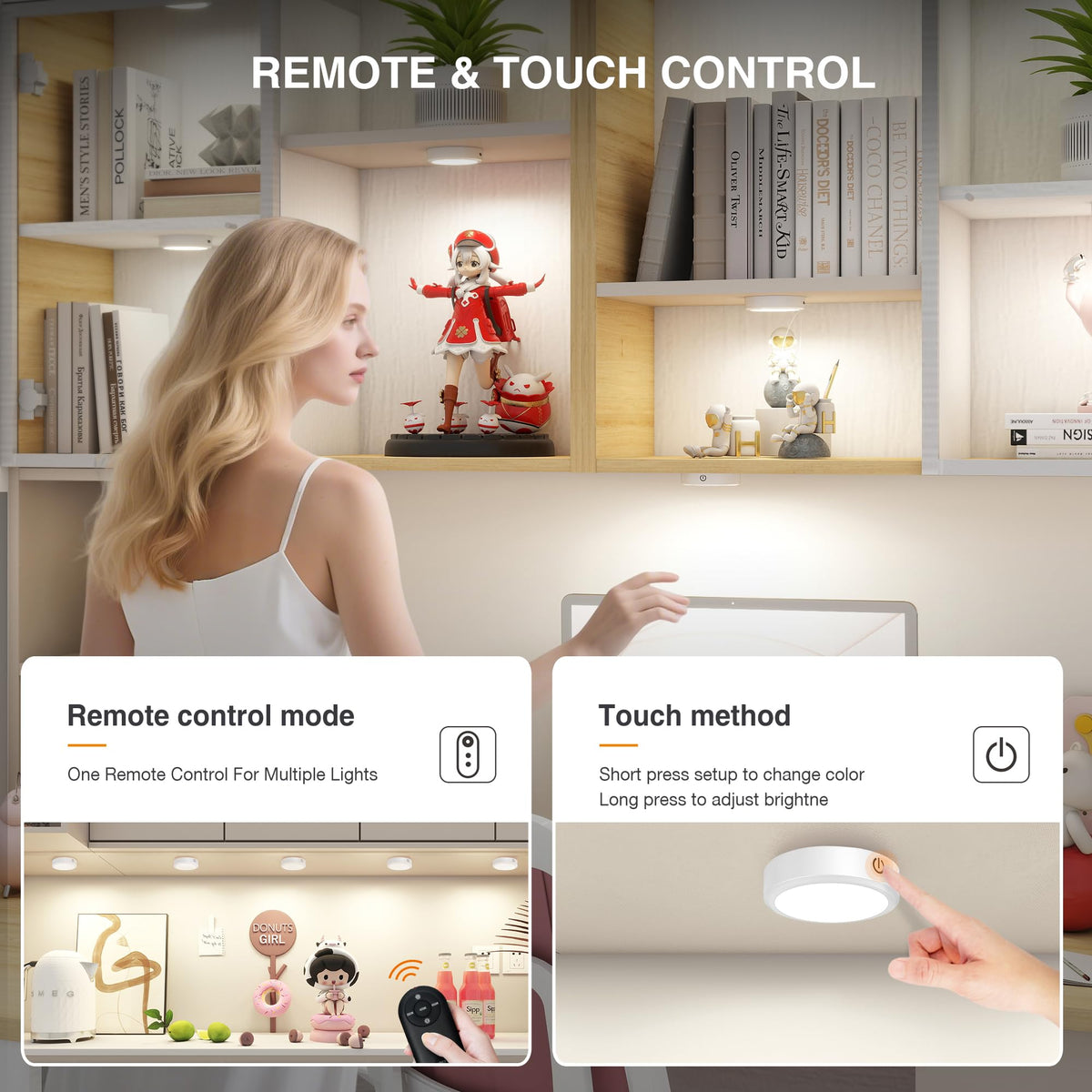 Q: How do you control the brightness and colors of the puck lights?A: The puck lights feature two control modes: you can adjust the brightness and color using the remote control or by tapping the on/off button. A quick tap changes the color, while a long press allows for brightness adjustments.