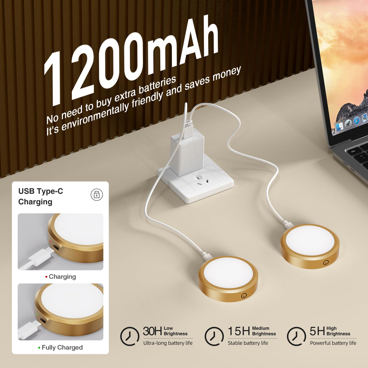 Featuring a unique full-screen design, each puck light is equipped with 42 LED beads that surround the edge, ensuring a brighter and more evenly distributed light compared to traditional lighting options. Made from durable plastic, these lights are not only functional but also stylish, making them an ideal addition to any room in your home. The rechargeable 1200mAh battery allows for up to 5 hours of continuous use on the brightest setting, while the included 2-in-1 Type-C fast charging cable ensures a quick recharge in just 2 hours. This eliminates the need for constantly replacing batteries, offering a more sustainable lighting solution.