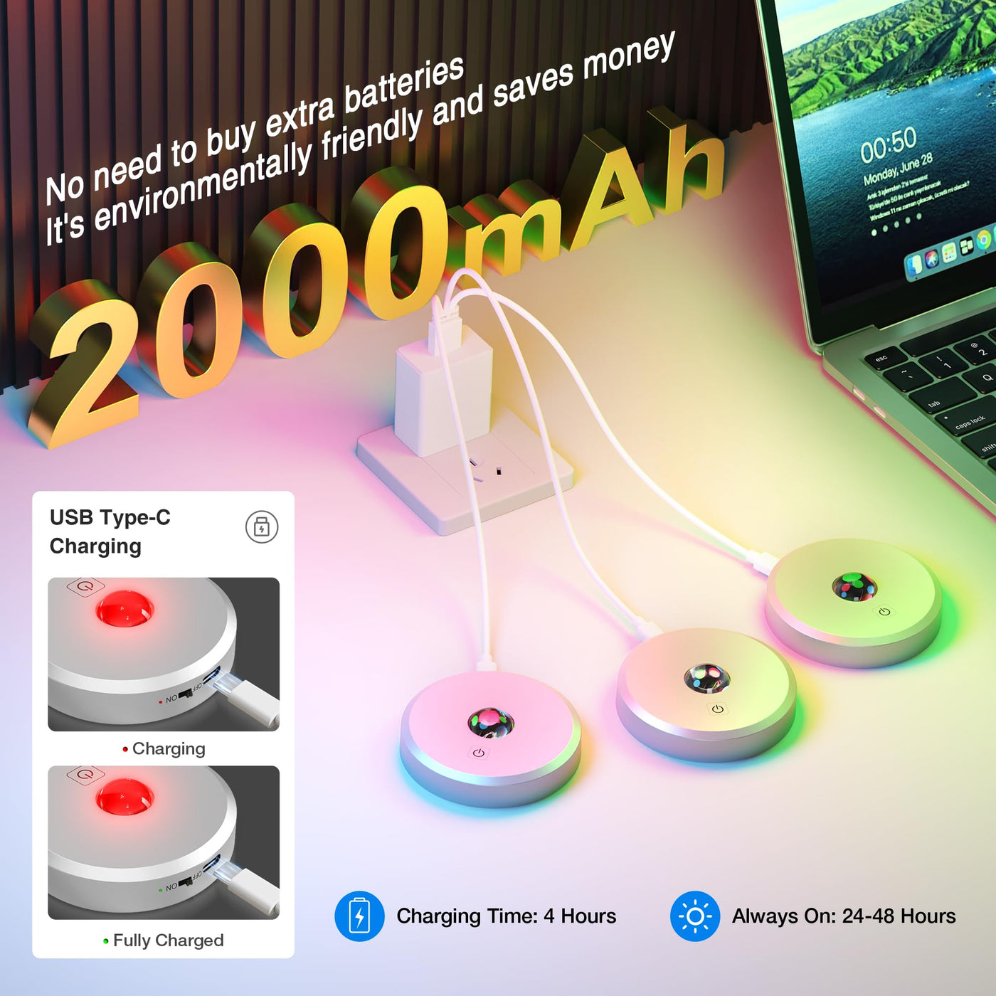 Q: Are the RGB puck lights energy-efficient?A: Yes, the RGB puck lights are designed to be energy-saving, thanks to their rechargeable battery which eliminates the need for disposable batteries.