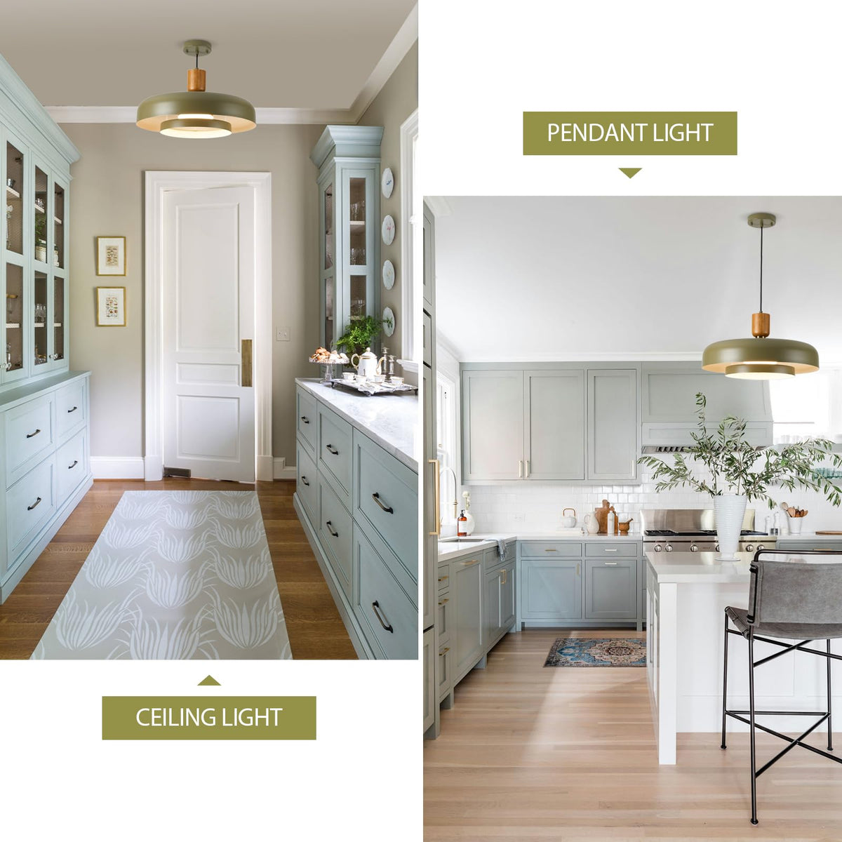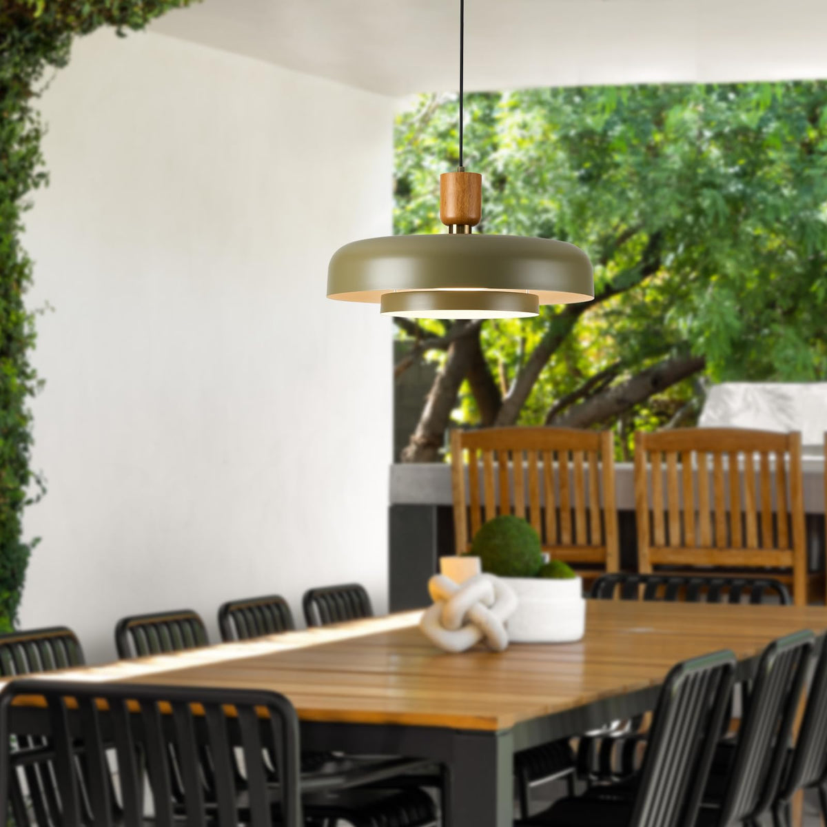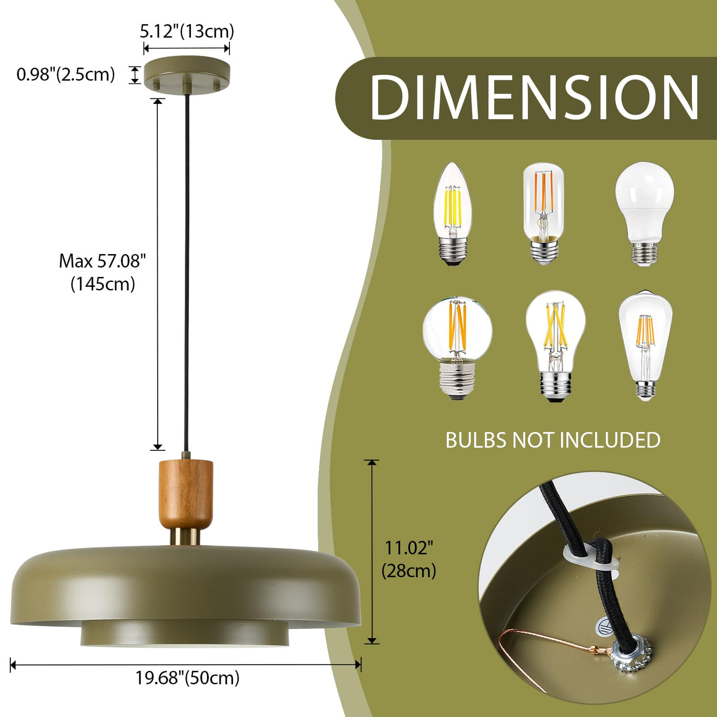 Mid Century Chandelier 19.68 Inch, Natural Wood And Brass Accent,2 Layered Deep Green Shade,Large Pendant Ceiling Lights For Kit