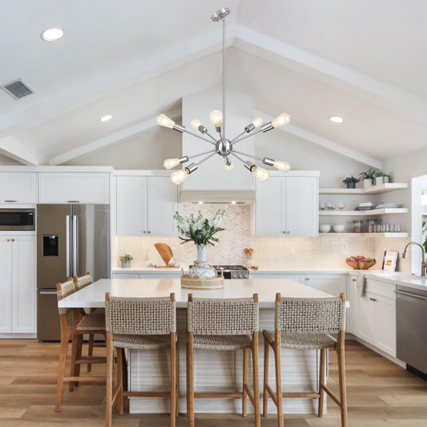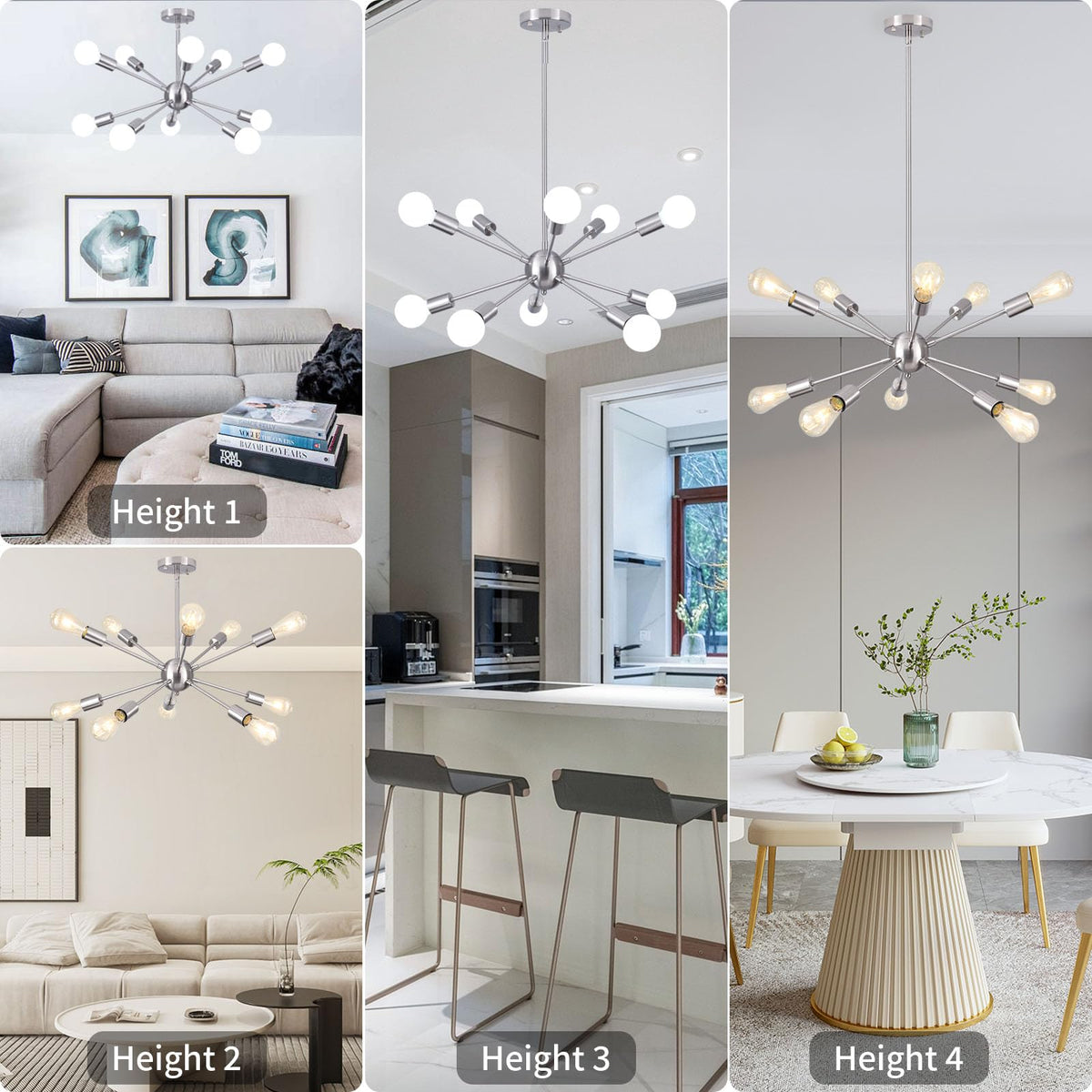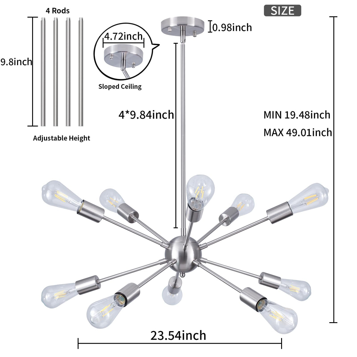 Sputnik chandeliers nickel 10 light sputnik light fixture, dimension of industrial chandelier:length 23.54 inches, diameter of ceiling base width 4.72 inches .The dining room light fixture brushed nickel have 4 x 9.8 inches extension rods, which allows you to adjust the height from 19.48 inches to 49.01 inches. You can purchase dimmable bulbs and compatible dimmer switches to use our mid century chandelier light fixture, so you can control the different lighting effects and brightness of the lights.This sputnik ceiling light is suitable for indoor use, suitable for the dining room, kitchen, living room, bedroom, foyer use, bar, coffee shop, restaurant, hallway, rustic, entryway