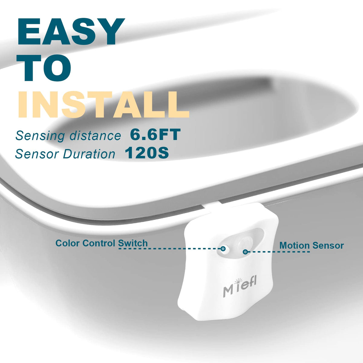 Q: How do I install the MIEFL Toilet Light?A: Installation is simple and requires no tools. The toilet light operates on 3 AAA batteries (not included). Just attach the light to the rim of your toilet bowl using the flexible arm, ensuring that the sensors are directed outward for optimal function.