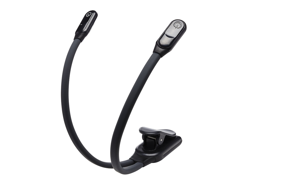 The DuoFlex Music Stand Light provides 40 lumens of dimmable and adjustable warm white light on two independent necks. Precision engineered optical grade lenses are specifically designed to distribute a wide field of consistent lighting with no hard edges. Powered by any standard micro USB cable or (3) AAA batteries, with a battery life of 15 hours (13’ micro USB cable included, batteries not included). The independent necks allow you to easily adjust the direction of light to suit your needs, and you can quickly adjust the light output on each head to three different levels by clicking the button on each head. Ideal for musicians, DJs, audio engineers, lecturers, or anyone who needs a wide field of portable light, or multi-angled light while working in tight spaces (such as automotive repair). Featuring 2 warm-tone High CRI LEDs (High Color Rendering Index LEDs) on each head that mimic natural lighting, The DuoFlex provides accurate color rendering and even light output. Colors appear more vibrant and true, and with minimal optical distortion. We quality test to FCC, CE, RoHS and Reach, UL, and California Prop 65 standards, and we audit our suppliers working and living conditions, and factory safety, to ensure high standards.