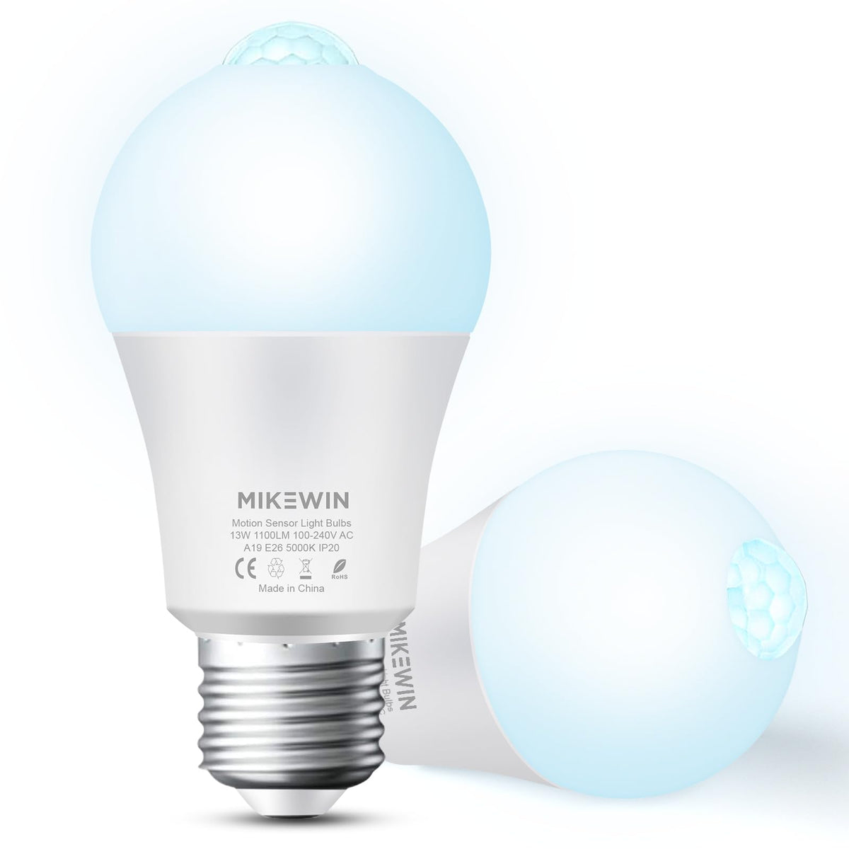 Mikewin Motion Sensor Light Bulbs Outdoor 2 Packs 13W(100W Equivalent) Security Led Bulb, Indoor E26, A19, 5000K Daylight Dusk T