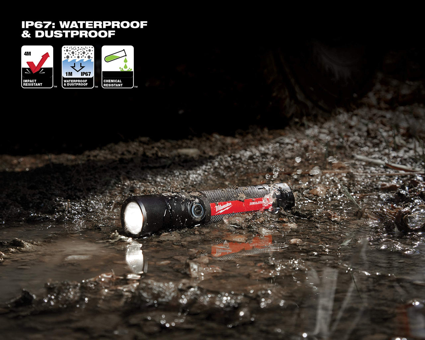 Q: Is the Milwaukee flashlight waterproof and durable?A: Yes, the flashlight is rated IP67, making it waterproof and dustproof. It can withstand submersion in water up to 1 meter and is rated for drops from heights of up to 4 meters.