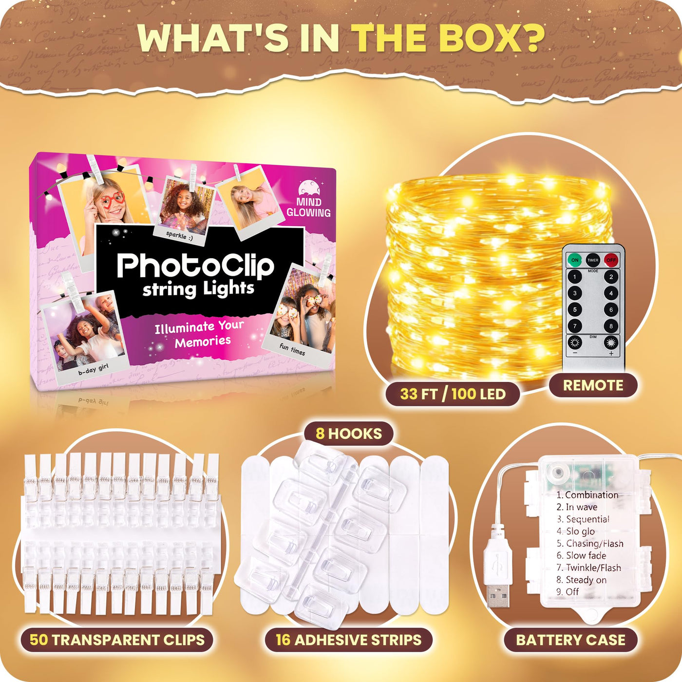 Unbox a World of Creativity: Everything you need to start decorating right away! Inside, you'll find a 16.4 ft copper string with 50 LEDs, a remote control, 50 transparent photo clips, 6 wall hooks, and 12 adhesive strips—all packed in a trendy, gift-ready box. Let your creativity flow and transform your space effortlessly!