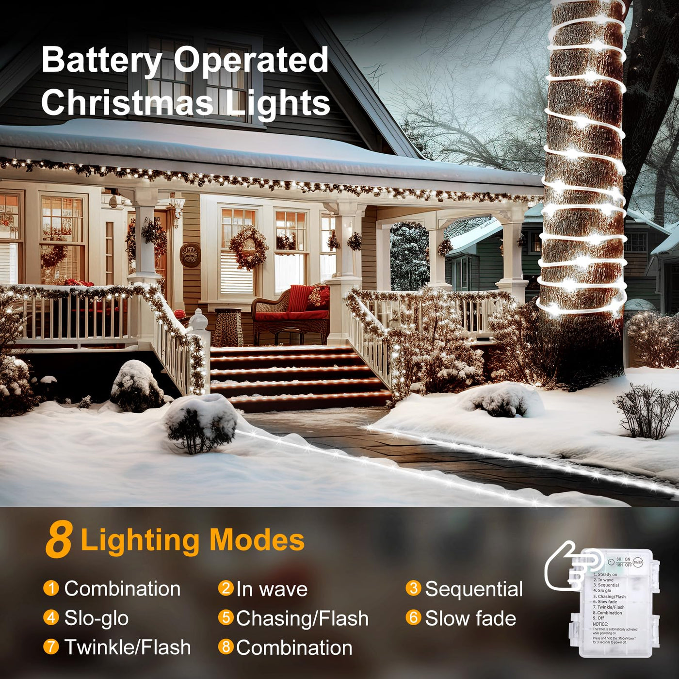 Minetom 2 Pack Battery Operated Christmas Lights Outdoor, Total 66Ft 200 Led Outdoor Rope Lights Battery Operated, Fairy Lights With Timer 8 Mode, String Lights For Outdoor Bedroom Indoor, Pure White