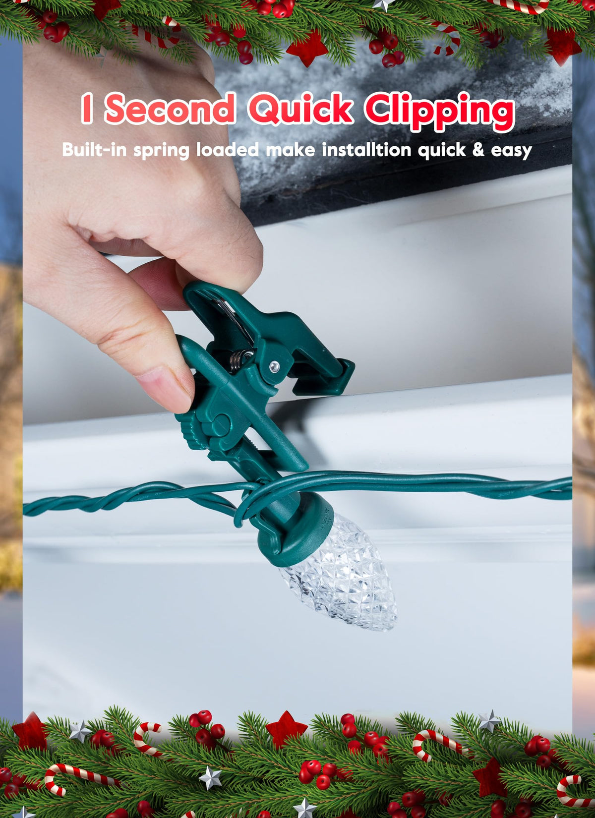 Q: Do the C9 string lights come with installation accessories?A: Yes, the C9 string lights include one hundred quick clips for easy setup and removal.